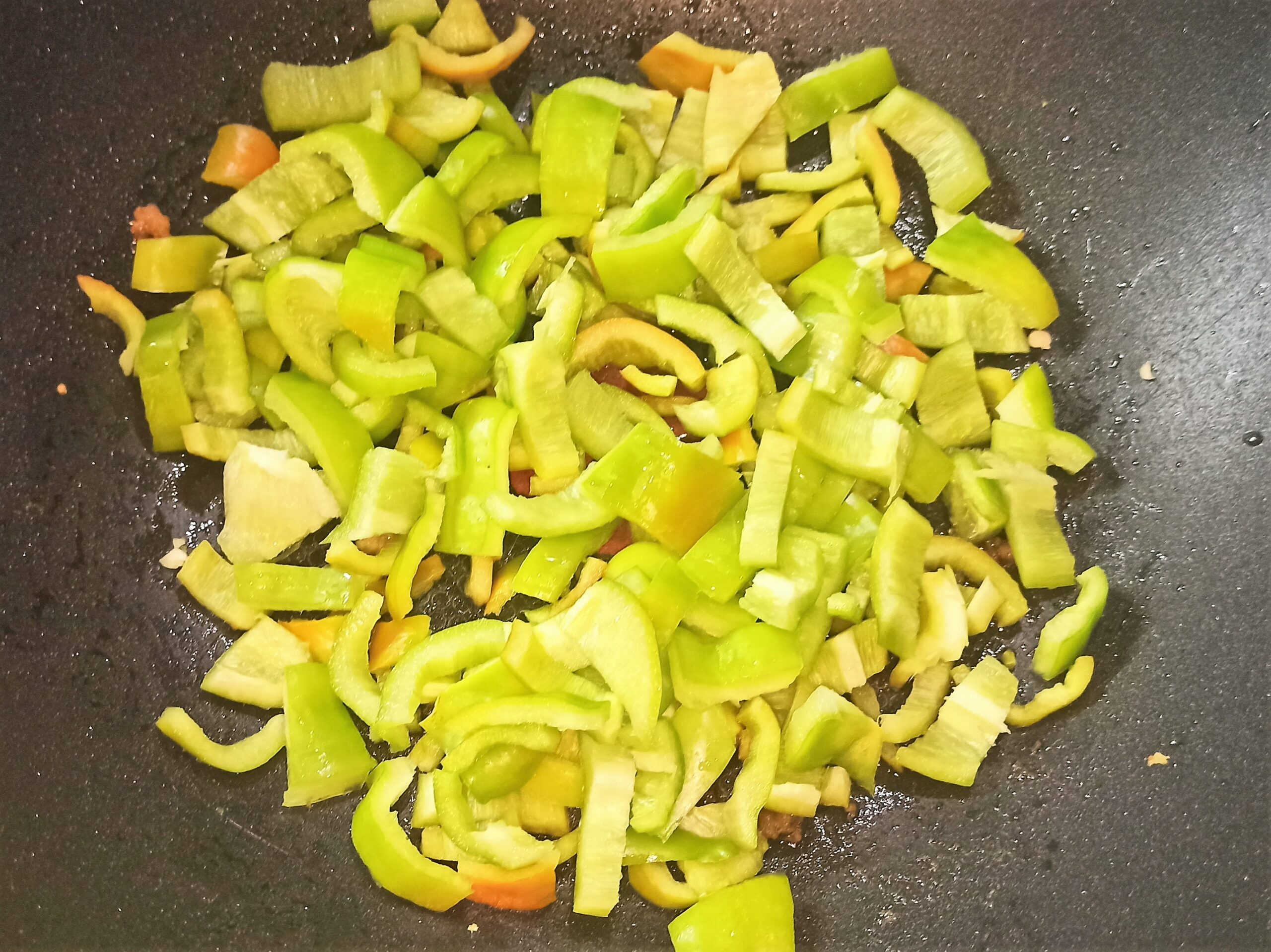 Lavate, pulite e tagliate a listarelle il peperone, fatelo cuocere nella stessa padella dove avete rosolato il pollo, se occorre aggiungete altro olio evo.