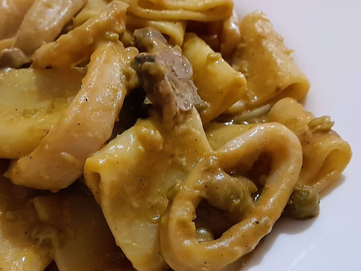 Paccheri con calamari piselli e funghi