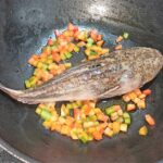 Per preparare i paccheri del marinaio, iniziate a pulire e lavare bene la lucerna, lavate e tagliate a pezzetti anche il peperone. In una capiente padella mettete un giro d’olio evo, e fate imbiondire l’aglio a fiamma media, poi eliminatelo.