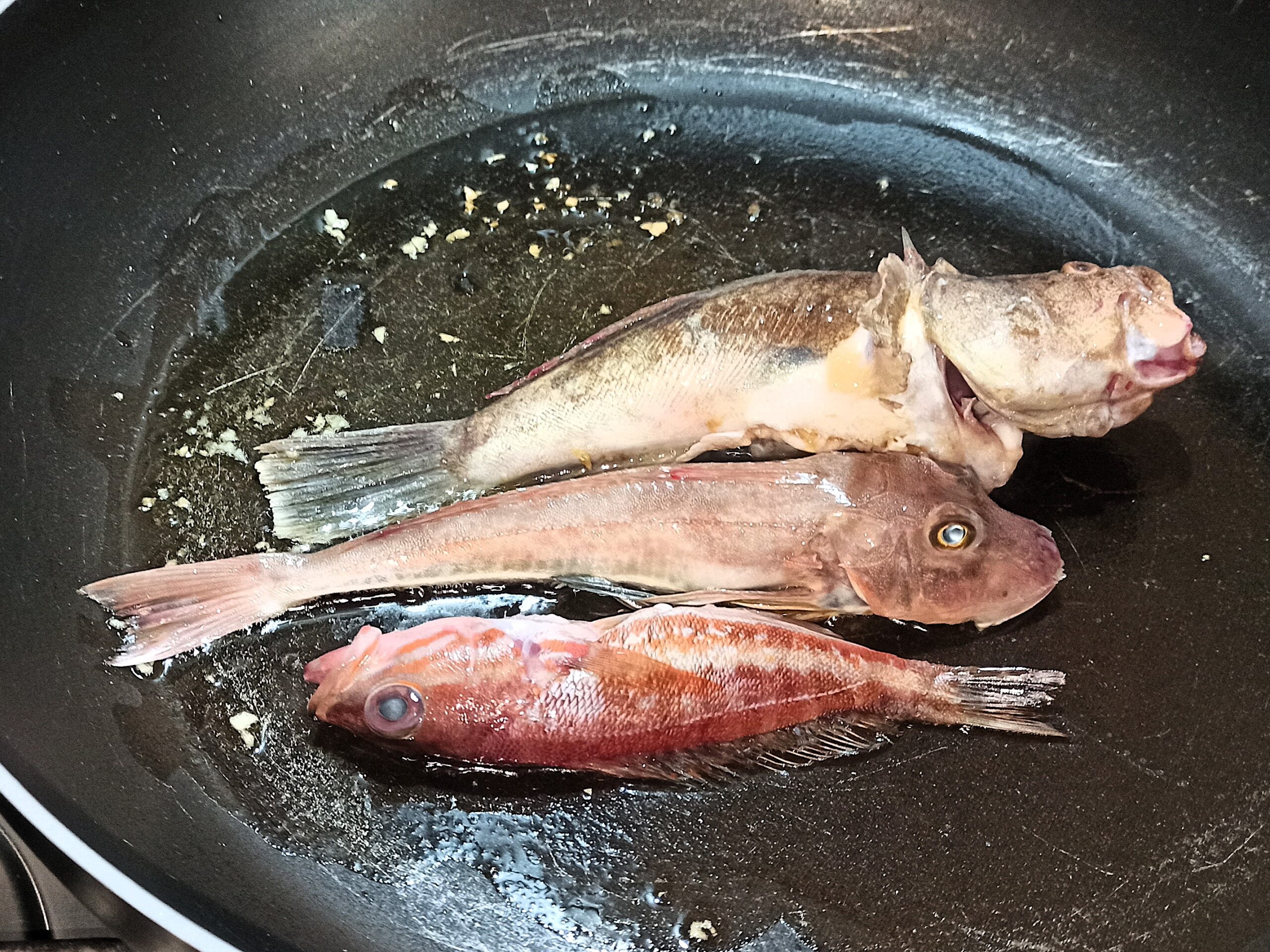 In una capiente padella, mettete un paio di giri abbondanti di olio evo, lo spicchio d’aglio tritato, e aggiungete i pesci per la zuppa, fateli rosolare, sfumate con il vino bianco, metteteli in un piatto. Appena si saranno raffreddati, con molta pazienza, eliminate tutte le lische.