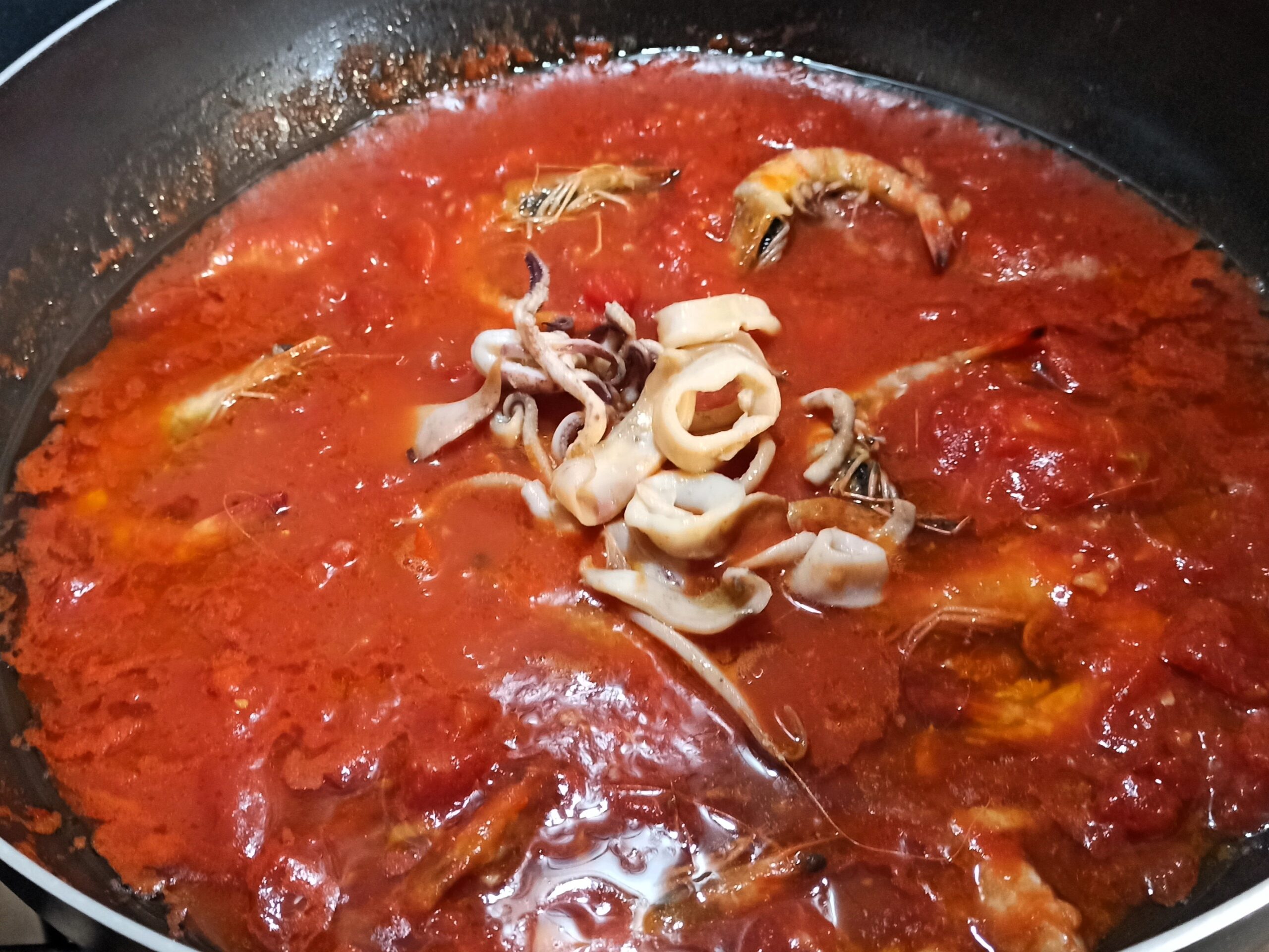 Nella stessa padella, cuocete anche le mazzancolle, ed ii calamaro tagliato ad anelli, mettete tutto da parte. Nella stessa padella, mettete il liquido rilasciato dai frutti mare,