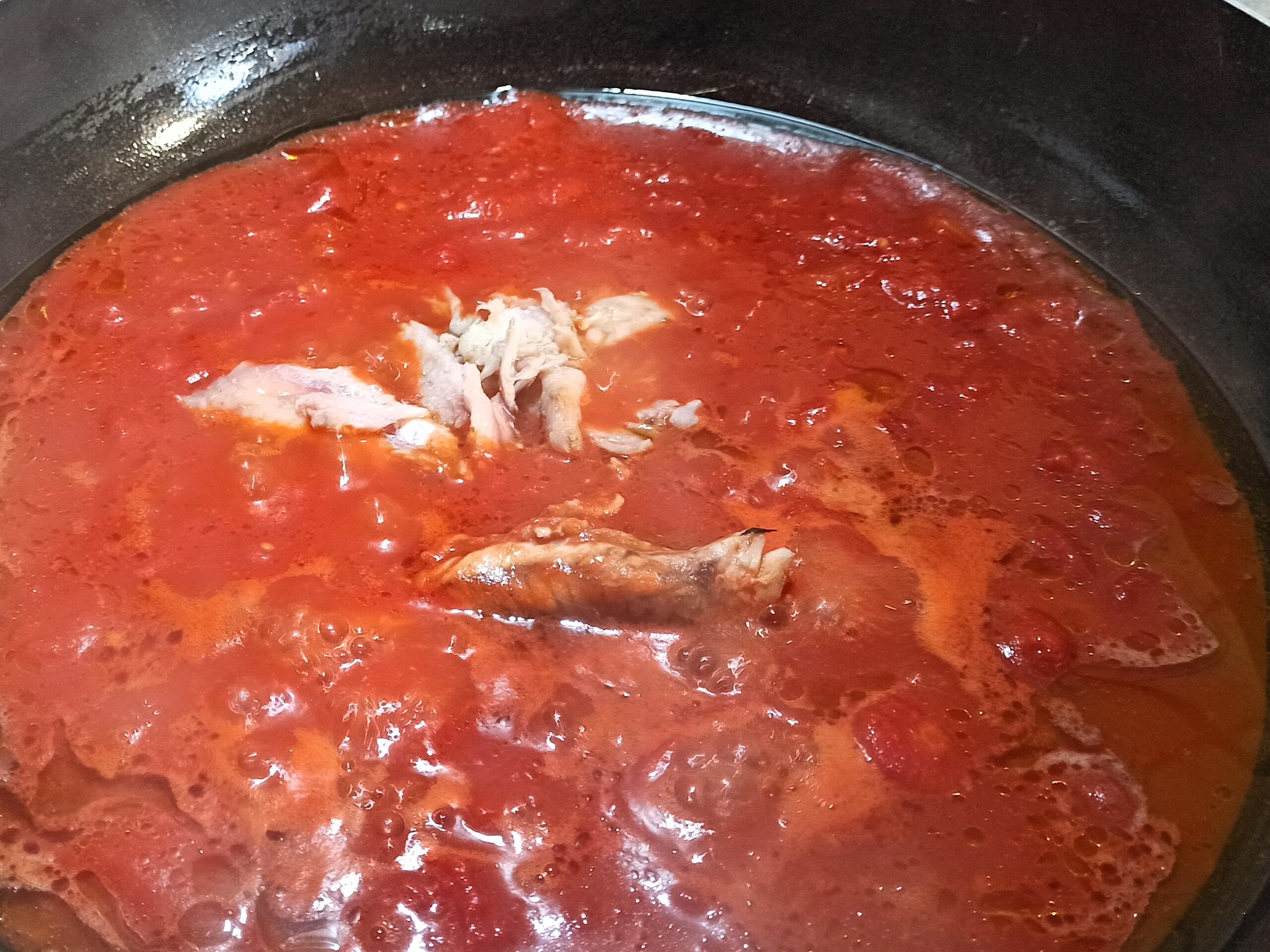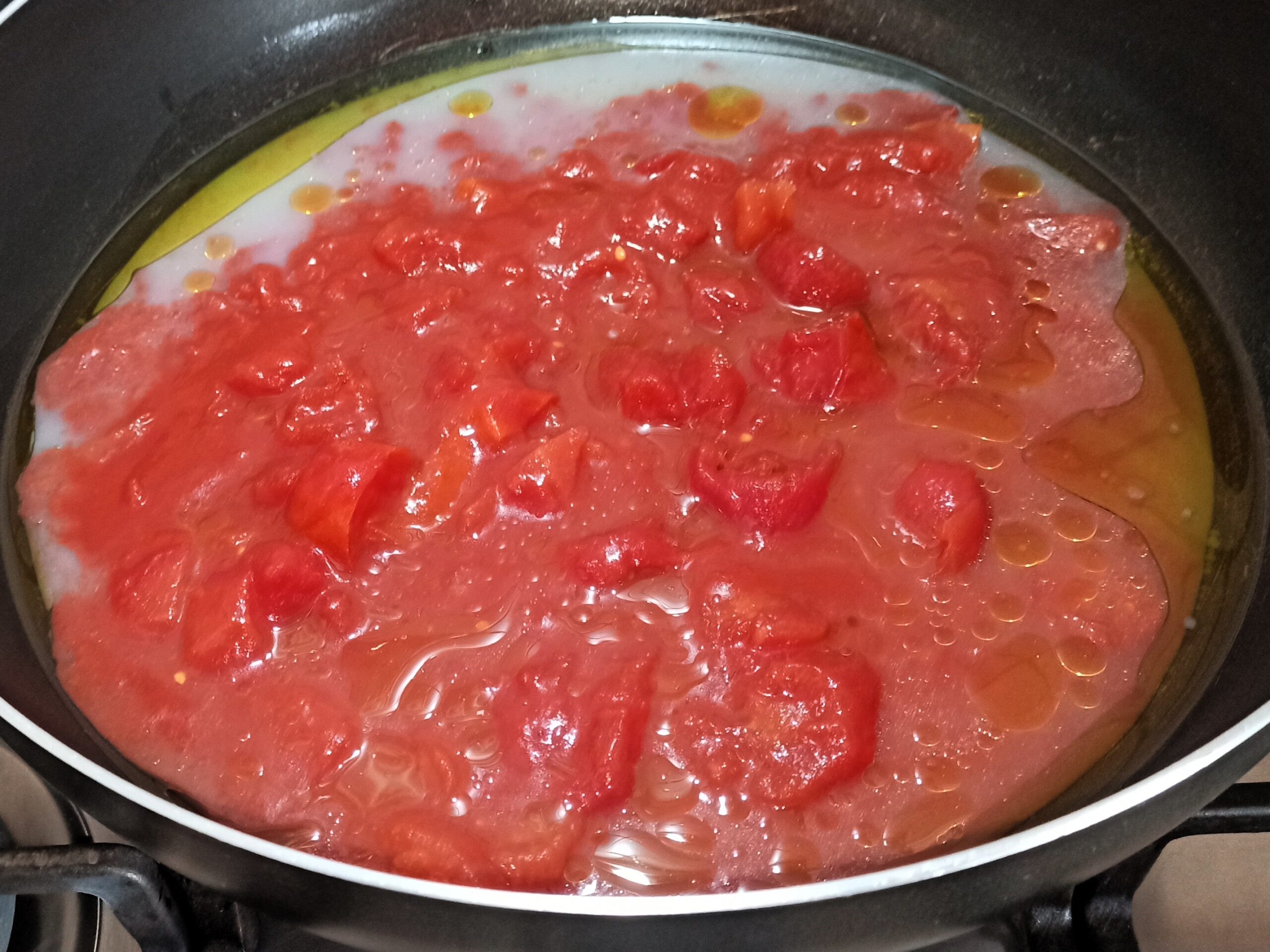 poi i pomodori pelati, leggermente schiacciati, se occorre aggiungete ancora un poco d’olio evo.