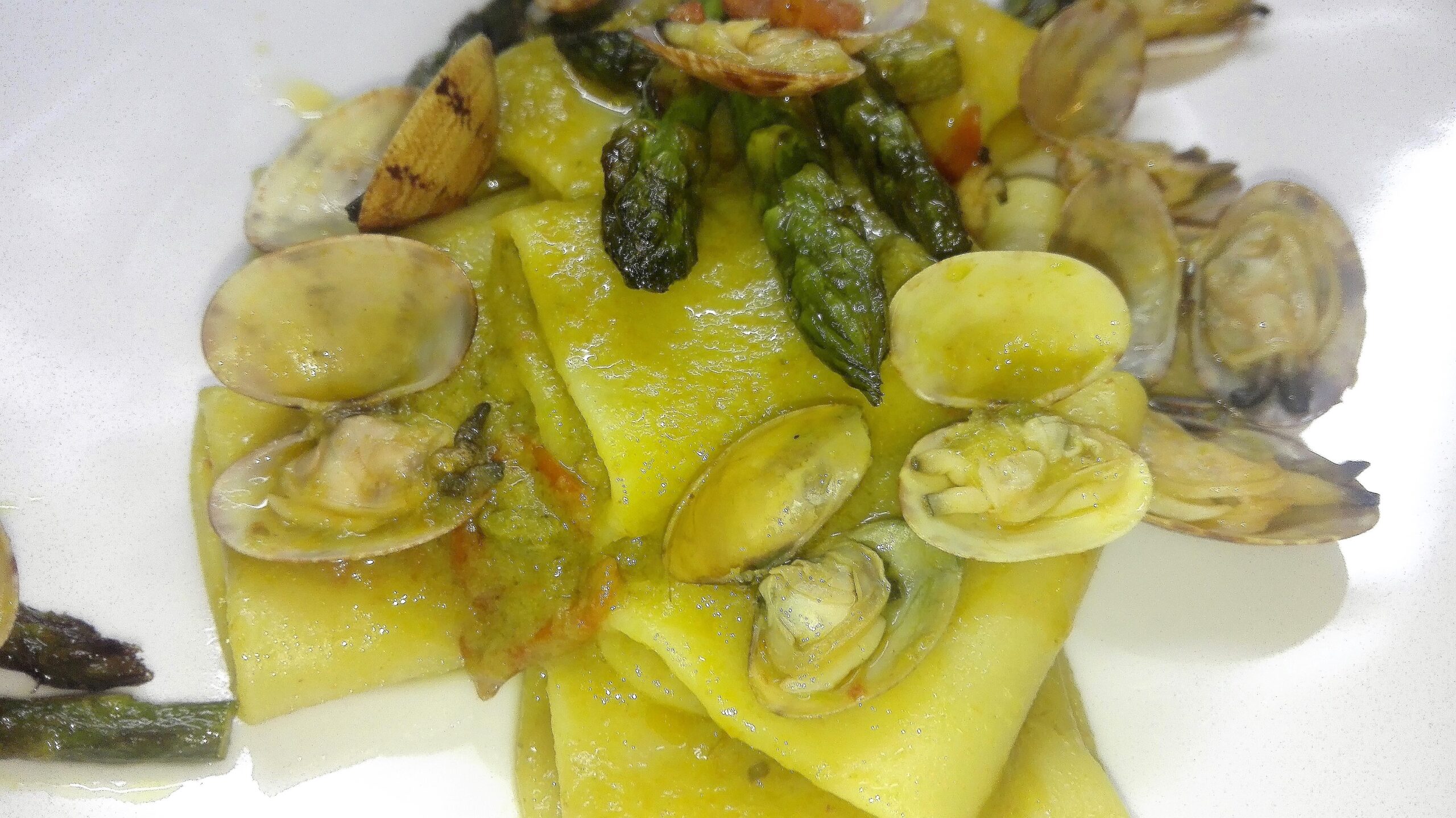 Eliminate la parte bianca, degli asparagi, lavateli bene, lessateli per tre minuti in acqua leggermente salata. Prelevate gli asparagi e fateli raffreddare su un tagliere, conservate l’acqua di cottura, per cuocere la pasta. Separate le punte dal gambo, e mettetele nella padella dove avete aperto le vongole, aggiungete un giro d’olio evo, e fate insaporire per un minuto, unite anche le vongole, ed amalgamate il tutto.