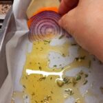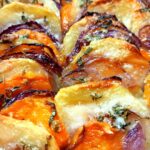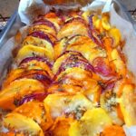 In una teglia mettiamo una parte del condimento dell’olio precedentemente fatto. Poi disponiamoci dentro in maniere alternata le patate la zucca e le cipolle( come da foto)per poi irrorare il tutto con il restante olio aromatizzato.