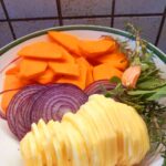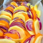 In primis prepariamo il condimento tritiamo l’aglio sminuzziamo il rosmarino la salvia e il timo mettiamo il tutto dentro una ciotolina dove uniremo l’ olio il sale il pepe e qualche piccolo pezzettino di peperoncino lasciamo insaporire.Nel frattempo peliamo le patate per poi tagliarle a fette non troppo sottili puliamo la zucca affettiamola dello stesso spessore delle patate ed infine le cipolle con la stessa procedura.