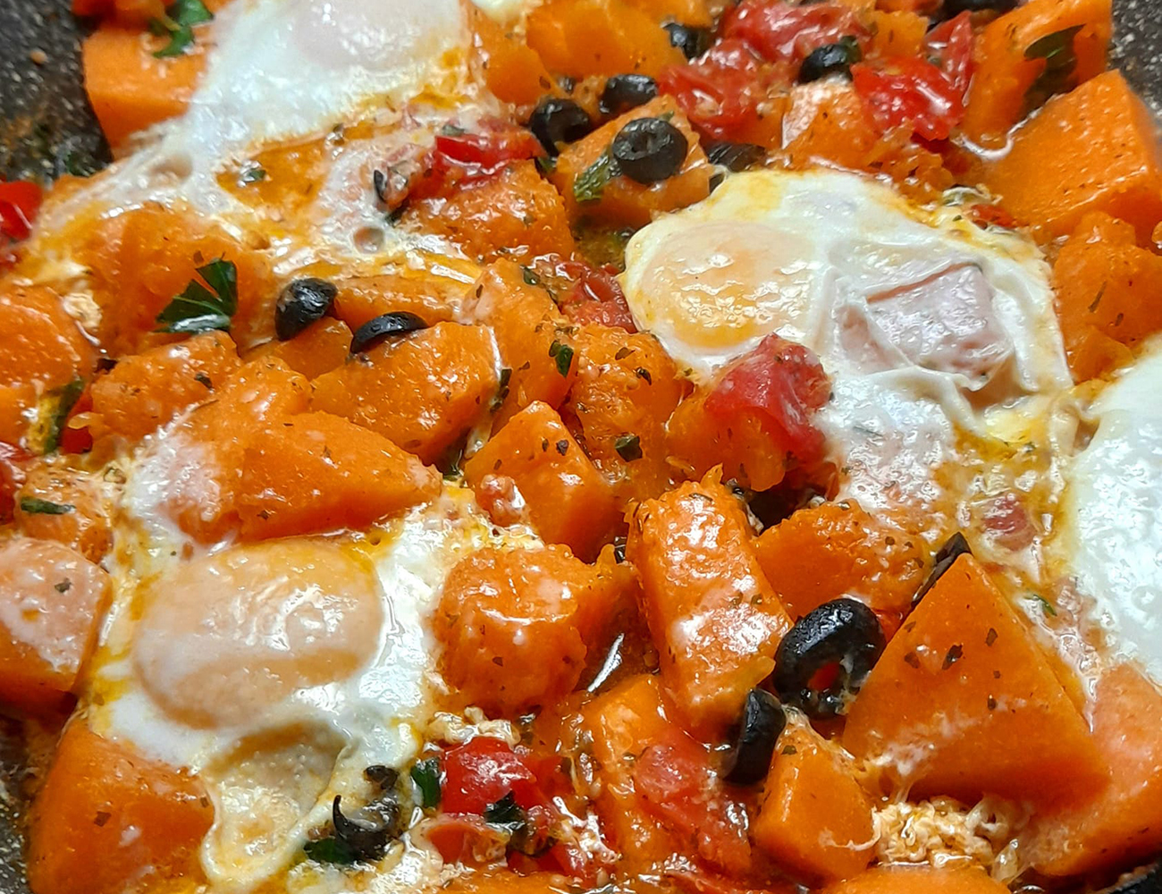 Quando la zucca è quasi cotta, crea due piccoli spazi tra i cubetti di zucca e pomodorini nella padella. Rompi un uovo in ciascuno di questi spazi. Copri la padella con un coperchio e lascia cuocere le uova a fuoco basso fino a quando gli albumi sono cotti e i tuorli ancora leggermente morbidi (o cotti a tuo piacimento). A cottura ultimata, spolvera la padellata con il grana grattugiato e una generosa manciata di prezzemolo fresco tritato. Servi subito, magari con una spolverata extra di pepe nero e un filo d’olio d’oliva a crudo, se lo gradisci.