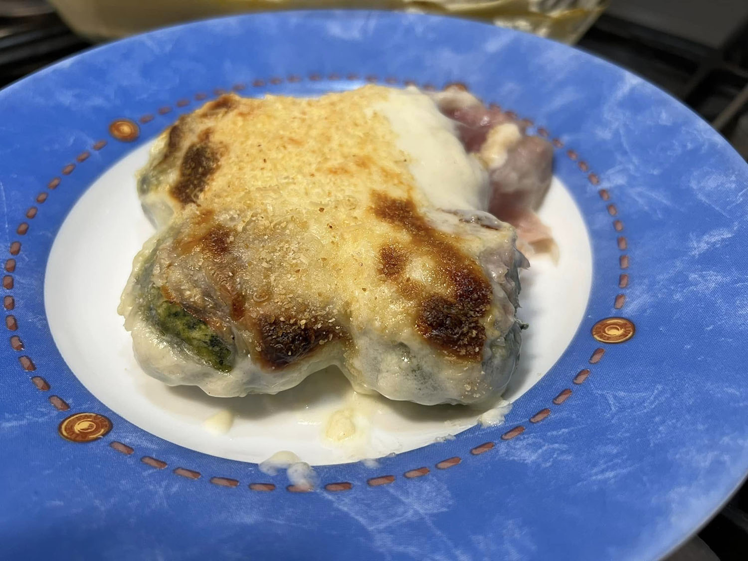 Ora formate delle polpettine, ciascuna del peso di circa 35-40 grammi (dovrebbero risultarne una trentina). Passate ognuna nella farina, assicurandovi di coprirla uniformemente. Disponetele in file affiancate in una pirofila precedentemente imburrata sul fondo e cosparsa di pangrattato. Sovrapponete le fette di prosciutto cotto. Aggiungete le fette di provola. Ricoprite il tutto con uno strato di besciamella.
