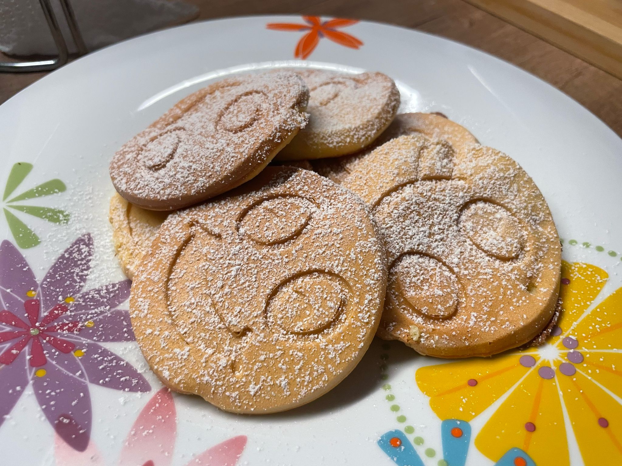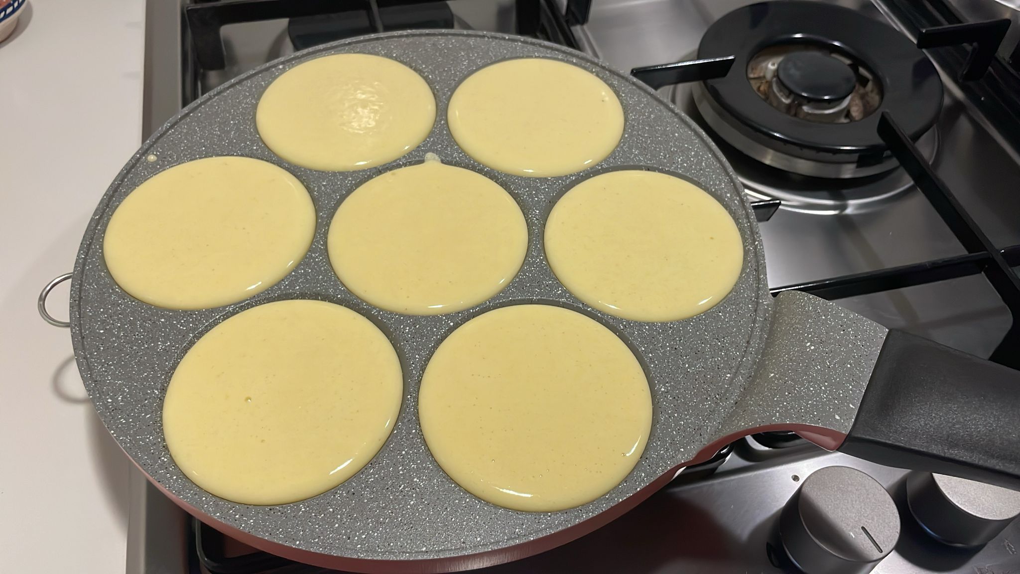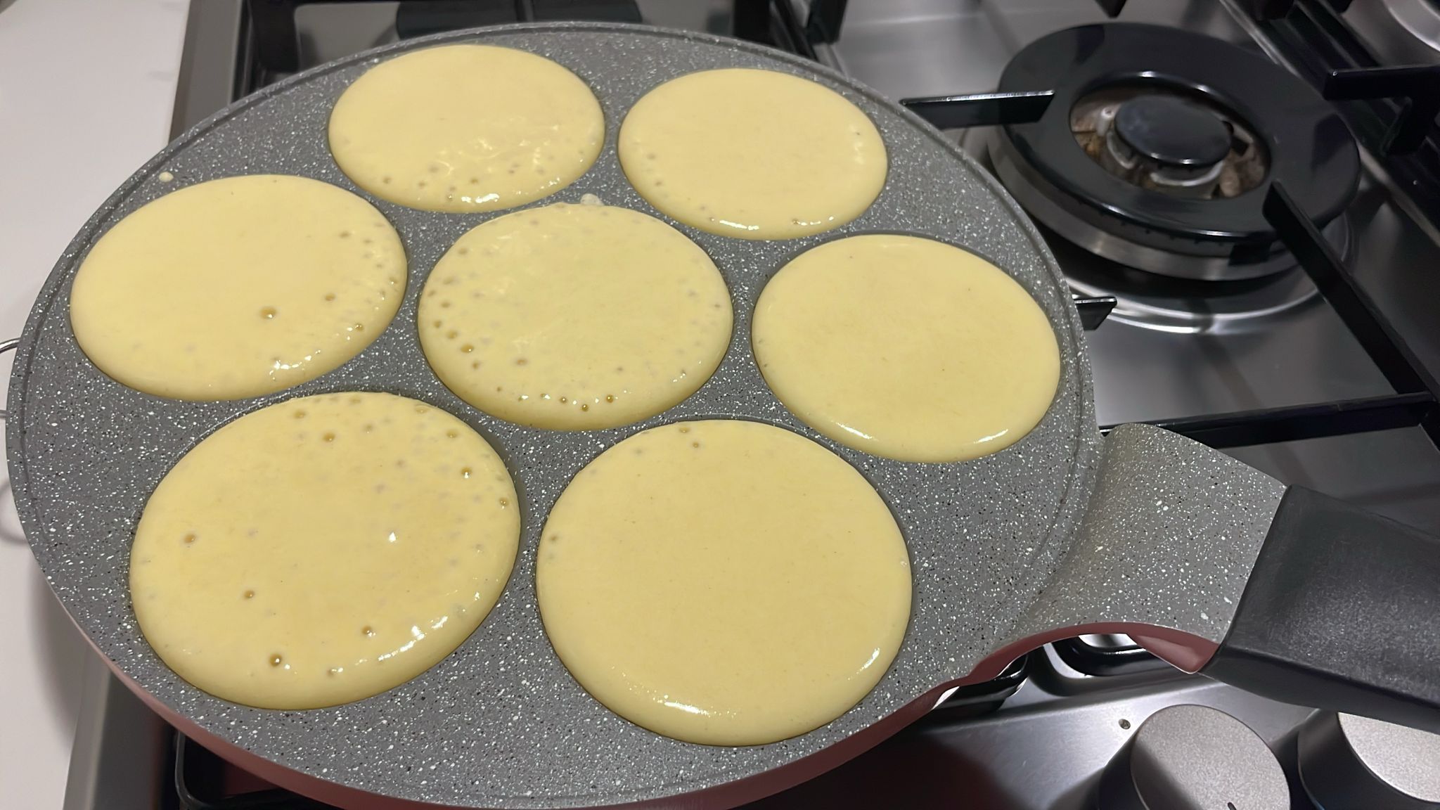 Fatta questa operazione andiamo alla cottura. In questo caso il nostro Stefano aveva a disposizioni una simpatica padella a formine adatta ai pancake. Facciamo scaldare, imburriamo lo stampo e cominciamo la cottura. Se sono piccoli ci vorrà giusto un minuto per lato ( una volta andata a regime la piastra). Ve ne accorgerete dalle bollicine che si formano sull’impasto ancora crudo ( vedi foto) Una volta cotti guarniteli come più vi piacciono: noi li abbiamo guarniti con dello zucchero a velo.