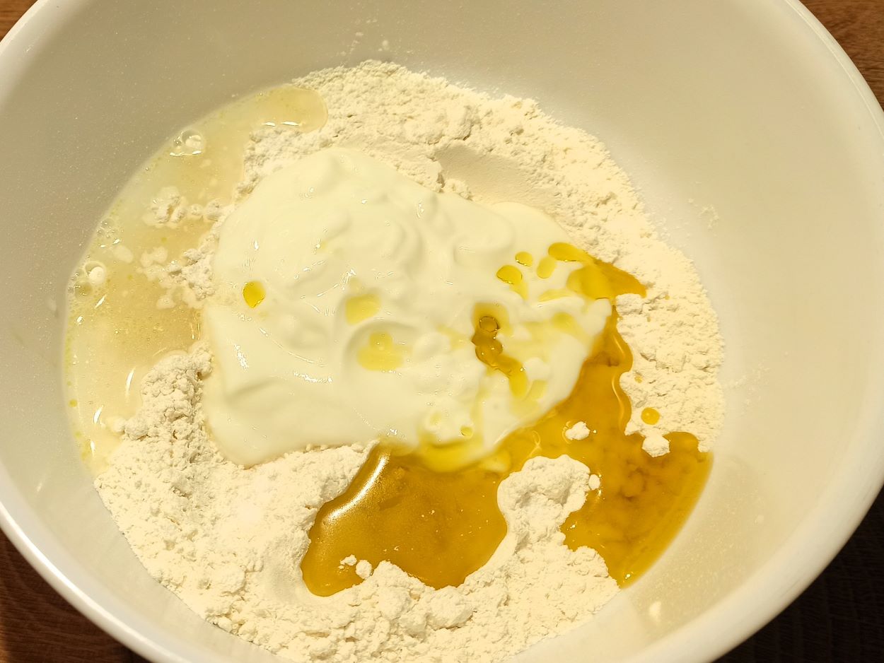 Per preparare il pane in padella senza lievito, mettete la farina in una ciotola, aggiungete gli altri ingredienti,