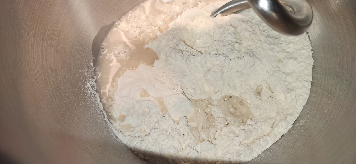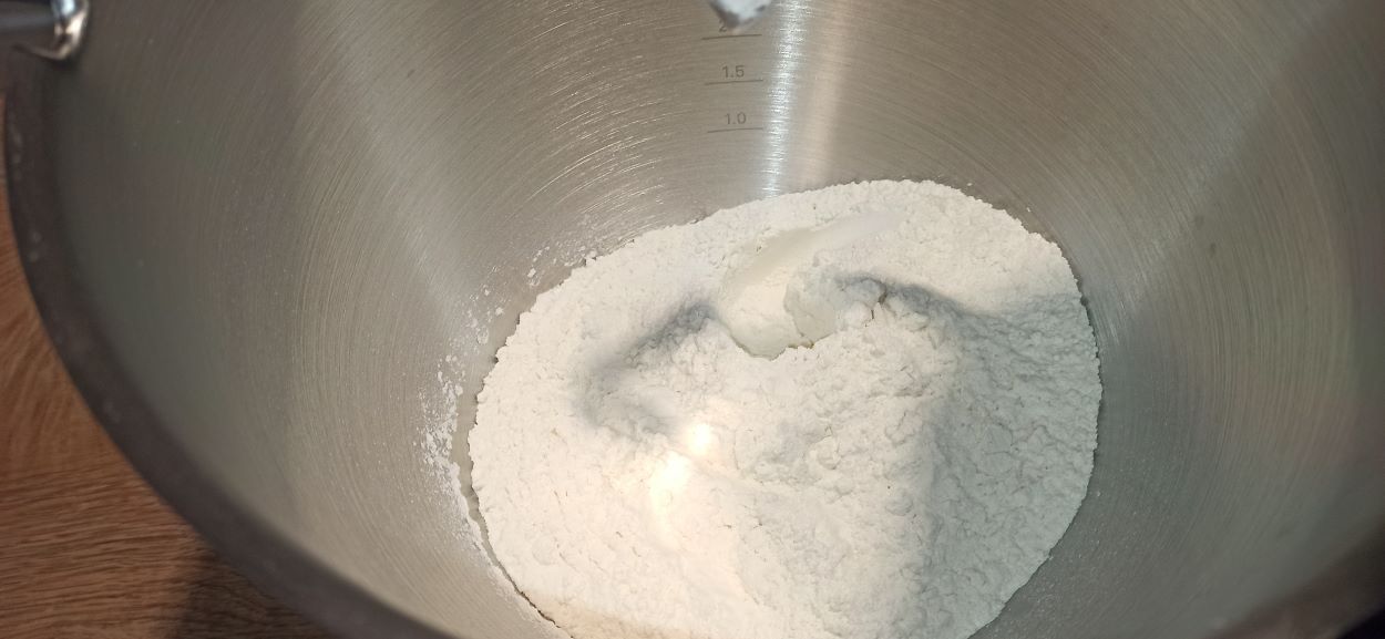 Per preparare il pane ciabatta, mettete la farina nella ciotola della planetaria, montate la frusta a gancio, ed iniziate a mescolare a velocità bassa.