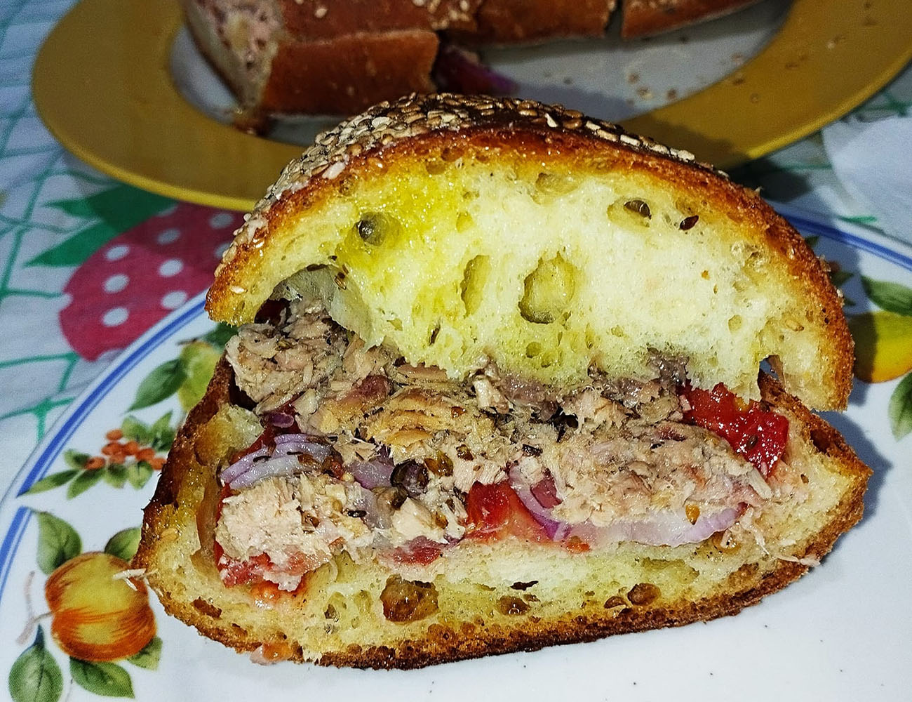 Versate un filo abbondante di olio extravergine d’oliva sopra il condimento. Se vi piace un sapore più deciso, aggiungete un pizzico di peperoncino. Chiudete il pane e premetelo leggermente per far insaporire bene tutti gli ingredienti. Lasciatelo riposare per qualche minuto prima di tagliarlo a pezzi e servirlo.