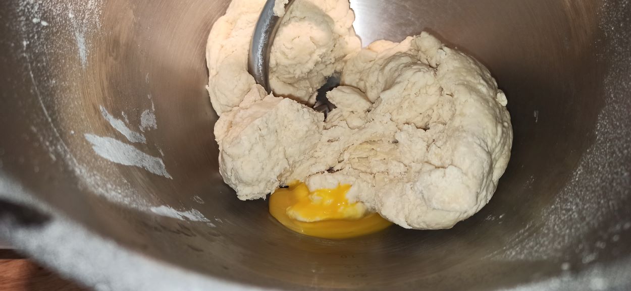 Versate a filo il latte e l’acqua. Fate lavorare per un paio di minuti, aggiungete prima l’uovo intero, appena sarà stato assorbito unite anche il tuorlo.