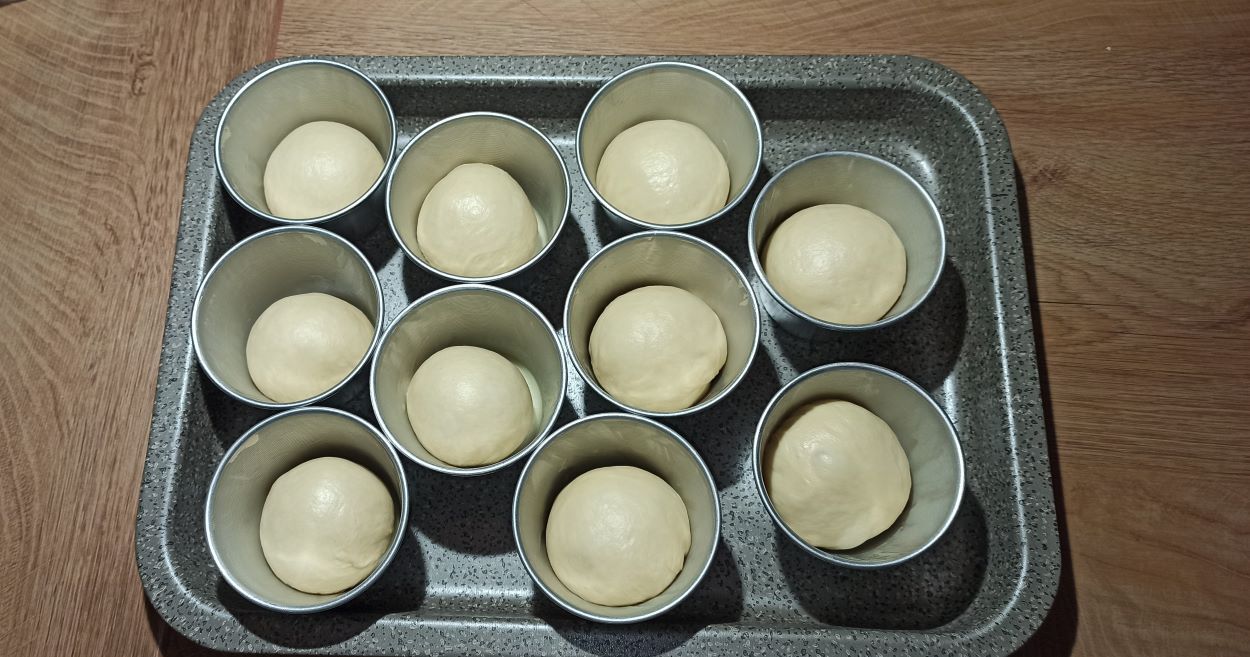 Trascorso questo tempo, imburrate e infarinate gli stampini, dividete l’impasto in dici parti uguali, formate della palline, e posizionate una pallina in ogni stampino.