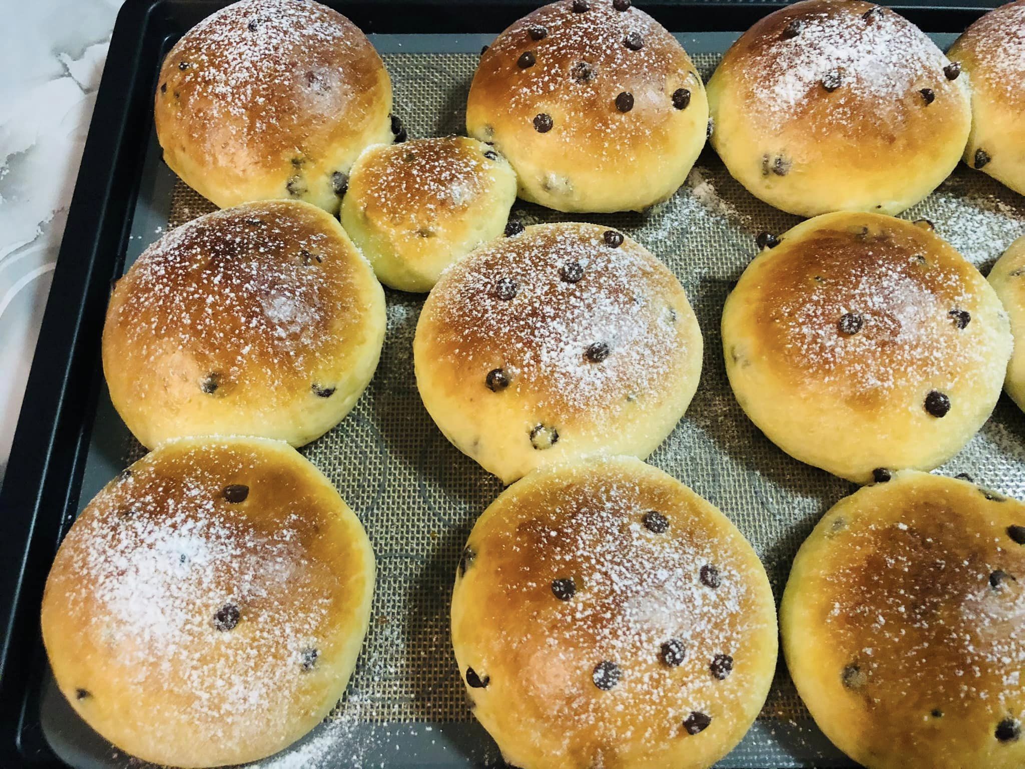 Rivestite una teglia con della carta da forno e disponeteci le palle, quindi lasciatele lievitare per altri 30 minuti. Intanto preparate la glassa. Mescolate farina, zucchero a velo e acqua sino a ottenere una pastella soda. Trasferitela in una sacca da pasticciere. Riprendete le palle e spennellatele con l’uovo sbattuto e un po’ di latte, quindi ricopritelo con la glassa. Fate cuocere in forno ventilato a 180 gradi per 20 minuti. I vostri pangoccioli sofficissimi sono pronti. Buon appetito.