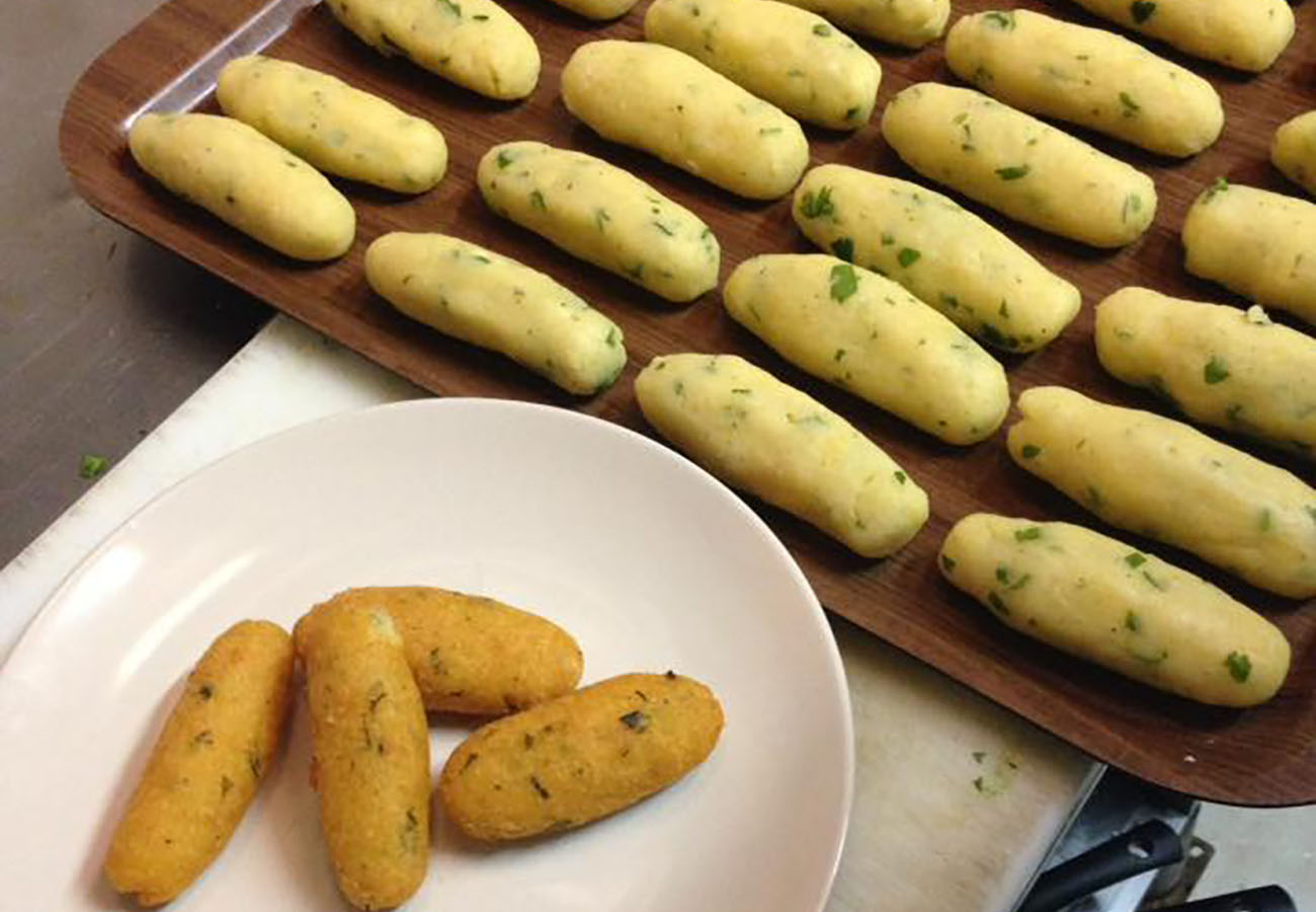 Formate dei cilindri lunghi di circa 10 cm, facendo un piccolo incavo al centro per inserire una striscia di mozzarella ben sgocciolata. Chiudete bene l’impasto intorno alla mozzarella. Passate i panzarotti prima nella farina, poi negli albumi leggermente montati, e infine nel pangrattato per impanarli.