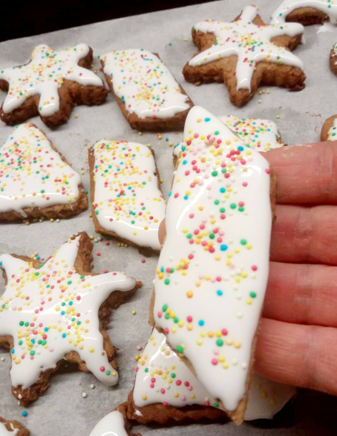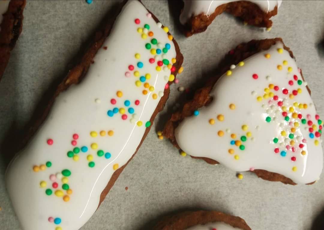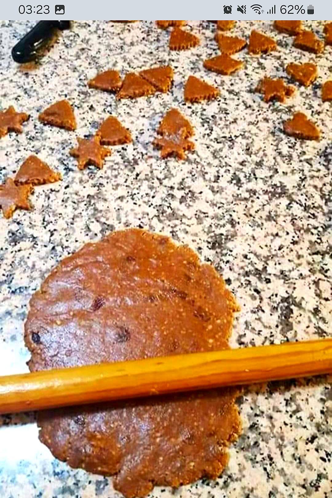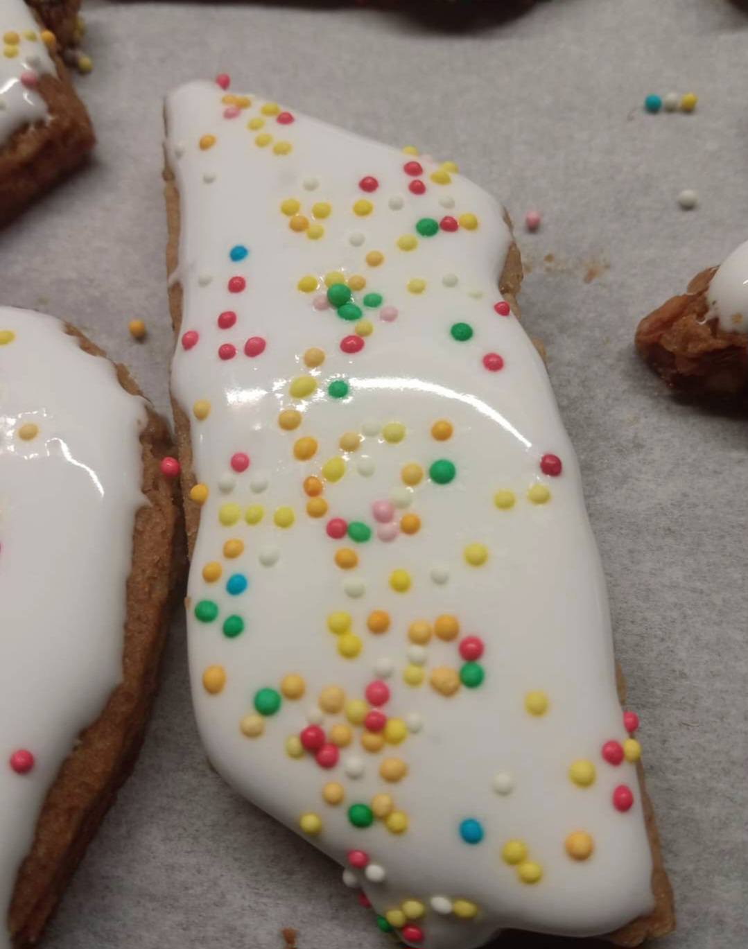 Prenderne un po’ per volta, formare dei piccoli filoncini e poi tagliarli a piacimento a mano o con formine.( la forma originale a rombo). Forno caldo 180 per 8/ 10 minuti. Lasciare raffreddare e coprirli con la cappa e decorare con diavoletti .