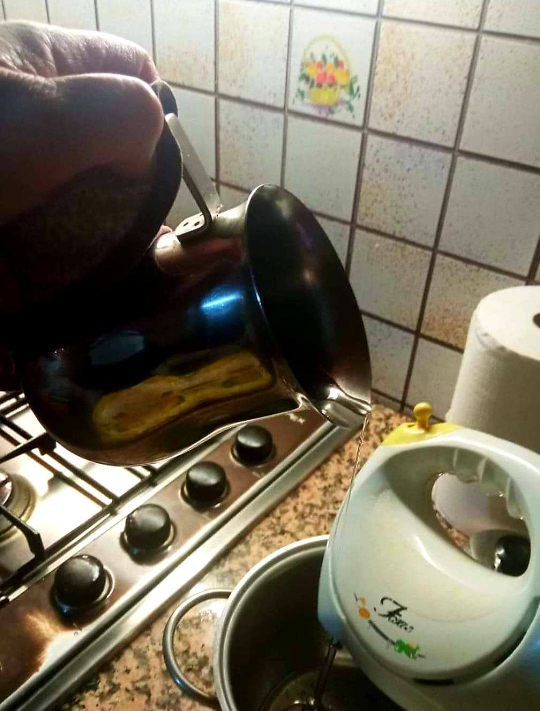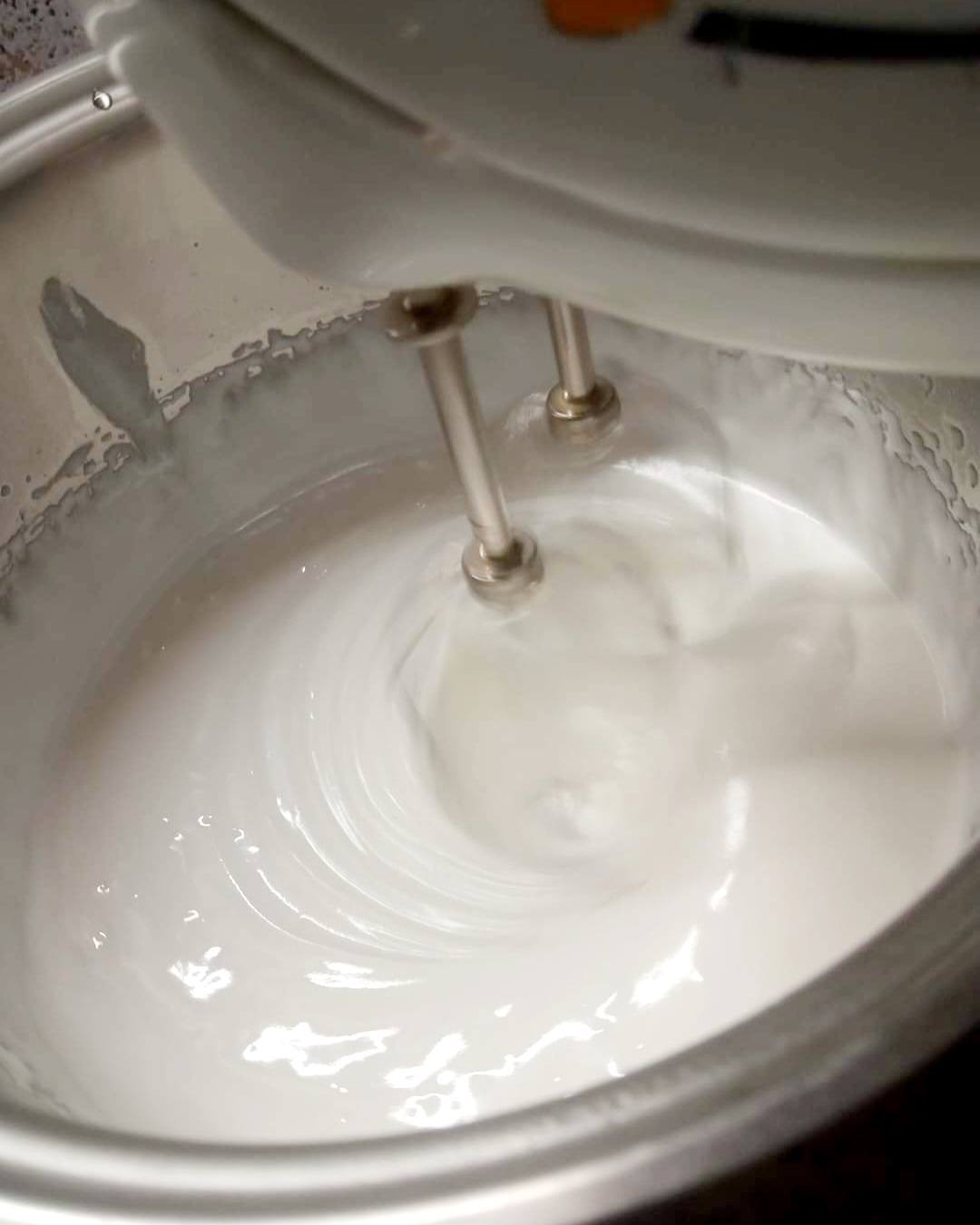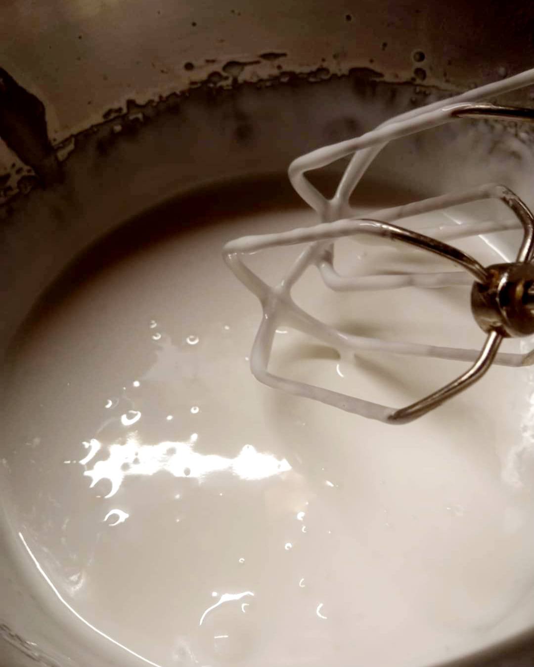 In un tegame mettere l’acqua e lo zucchero lasciarlo sciogliere a fiamma bassa mescolando ogni tanto ..sara’ pronto.quando farà ” il filo”.( guardate foto.). Intanto iniziare a battere lievemente l’ albume quando lo sciroppo sarà pronto portarlo con tutto il tegame ad una certa altezza per poi colarlo lentamente nel recipiente dove contemporaneamente batterete l’ albume senza mai fermarvi.