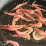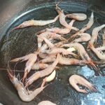 Per preparare la pasta ai tre gamberetti, iniziate a lavare bene i gamberetti, eliminate la testa ed il carapace dalla metà dei gamberetti, che userete per preparare un fumetto. In una capiente padella, mettete un giro d’olio evo, uno spicchio d’aglio e fate rosolare, separatamente, l’altra metà dei gamberetti.