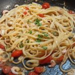 Cuocete la pasta, nel fumetto che avete preparato, colatela al dente direttamente nella padella, aggiungete il prezzemolo tritato, amalgamate il tutto.