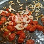 Metteteli da parte in una ciotolina. Appena si saranno raffreddati, sgusciateli, e con l’aiuto di uno schiacciapatate, schiacciate sia le teste che i carapaci, recuperando tutto il condimento direttamente nella padella. Aggiungete i pomodorini tagliati a metà, un poco di fumetto, e fate cuocere a fiamma media per pochi minuti.