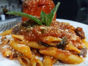 Pasta al “puparuolo imbuttunato”, un piatto gustoso e ricco che prende ispirazione dal celebre peperone imbottito napoletano, utilizzando proprio gli ingredienti tipici del ripieno per condire la pasta. Questa pasta è un piccolo omaggio alla tradizione napoletana, in una versione sfiziosa e “scomposta” del classico puparuolo imbuttunato.