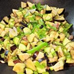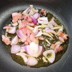 In una capiente padella mettete un giro d’olio evo, unite il guanciale e la cipolla, soffriggete per un paio di minuti poi unite le rimanenti verdure.