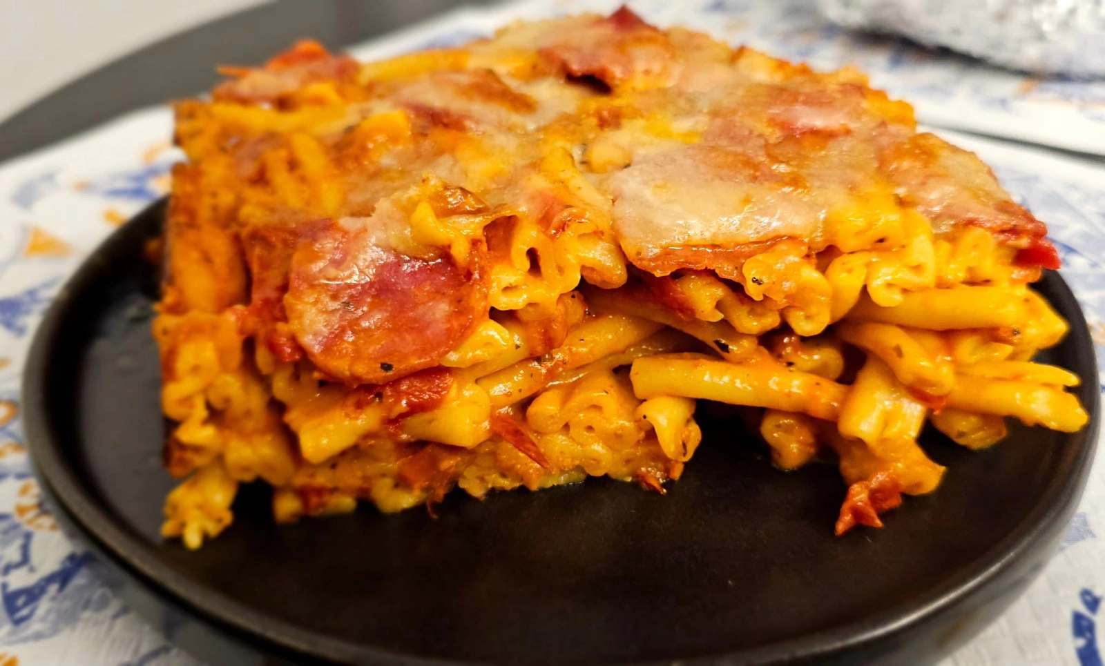 In una teglia da forno leggermente unta, fai un primo strato di pasta. Aggiungi fette di salame, cubetti di mozzarella e una spolverata di parmigiano. Ripeti con un altro strato fino a esaurimento degli ingredienti. Termina con abbondante salame a fette in superficie e ancora parmigiano. Cuoci in forno preriscaldato a 200°C per circa 20-25 minuti, fino a doratura della superficie. Gli ultimi 5 minuti puoi usare il grill per una crosticina extra croccante.