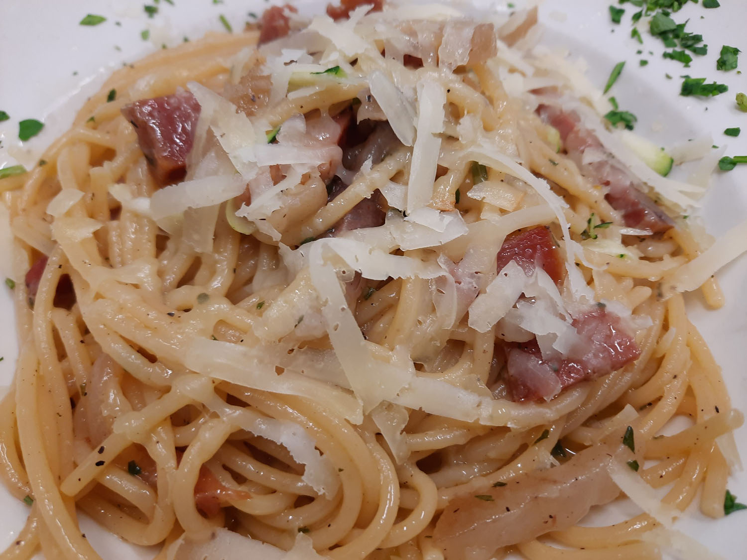 La prima cosa da fare per preparare la pasta alla fiaccheraia è mettere sul fuoco l’acqua salata per la pasta. Il condimento infatti può essere preparato mentre questa è in cottura. Mentre aspettate che raggiunga il bollore, passate al condimento. Tagliate la cipolla a fettine molto sottili. La pancetta, che deve essere alta all’incirca 2 centimetri, deve essere tagliata e cubetti. Intanto l’acqua starà bollendo e potete calare gli spaghetti o, se preferite, un formato di pasta corta.