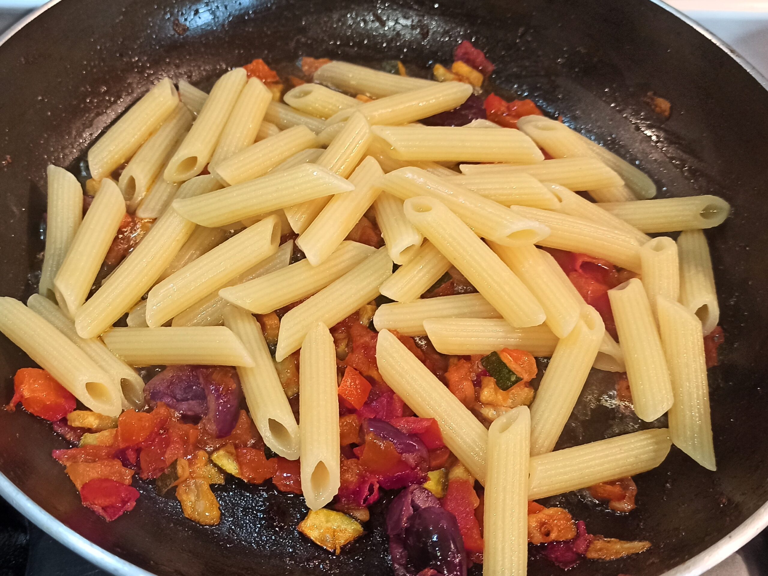 Cuocete la pasta al dente, colatela direttamente nella padella, aggiungete un poco d’acqua di cottura della pasta.