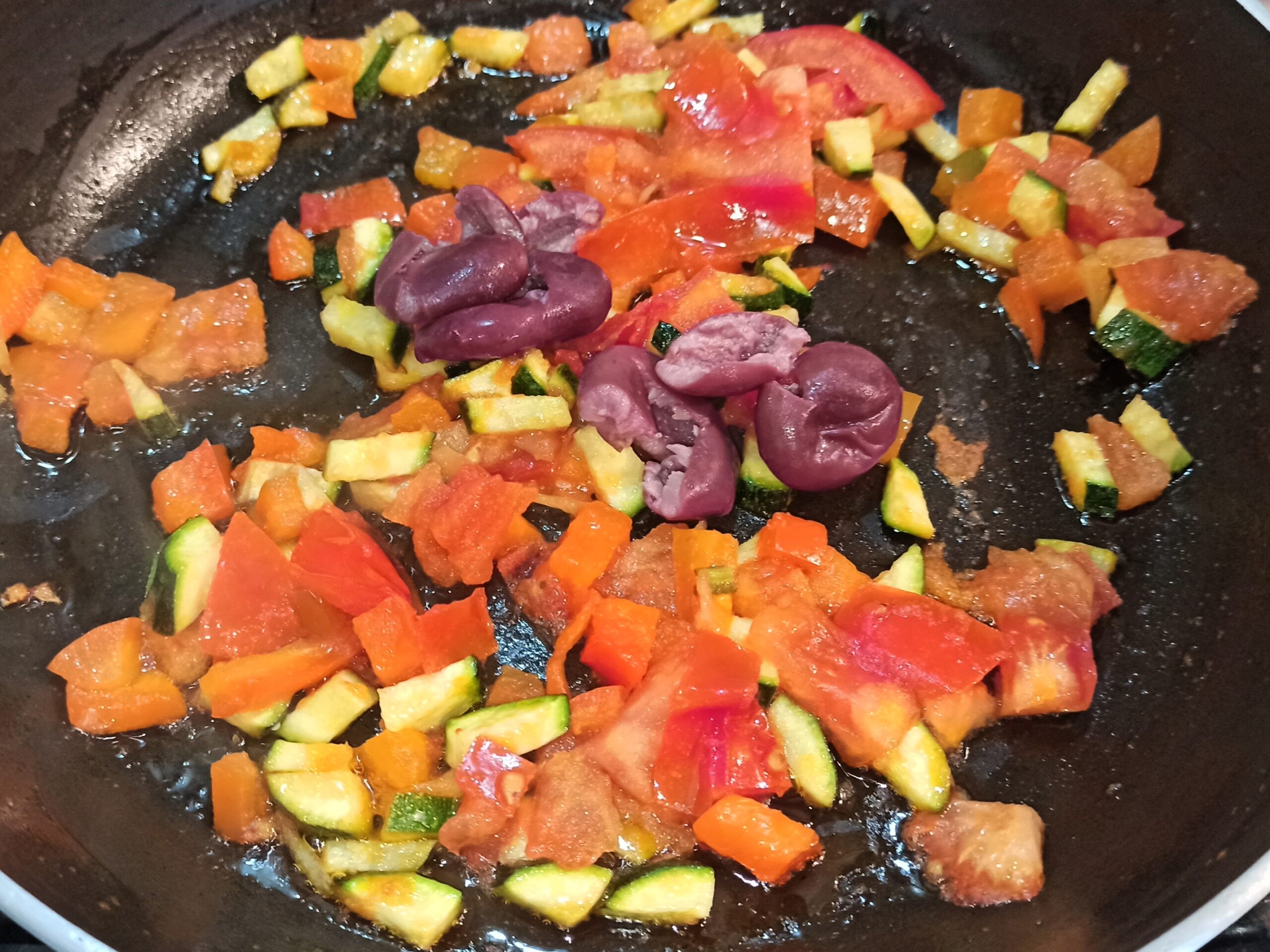 In una capiente padella, mettete un giro abbondante di olio evo, poi unite la cipolla tagliata a fettine sottili, l’aglio tritato, e le verdure. fate cuocere a fiamma media con la padella semicoperta, aggiungete anche le olive e regolate di sale.