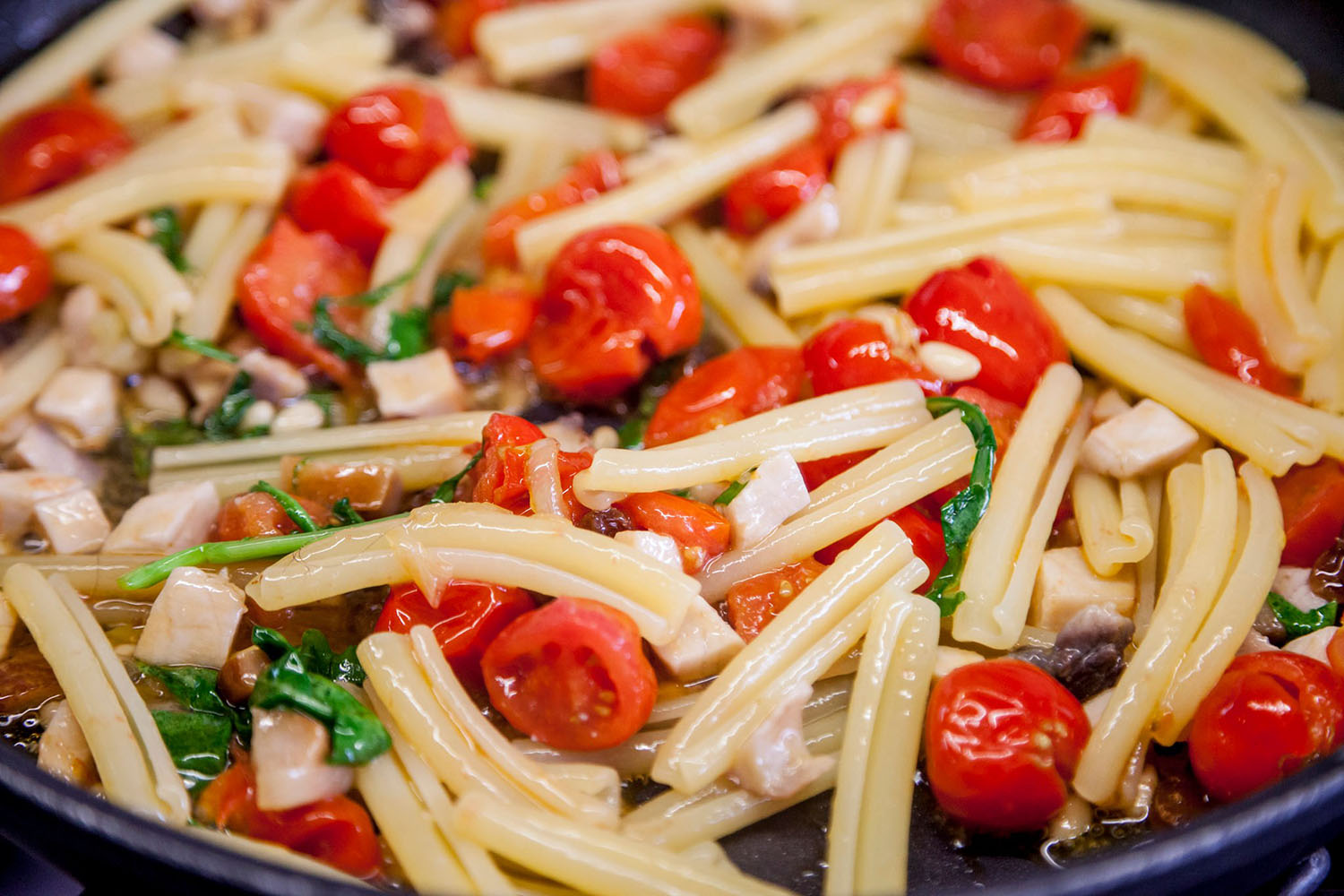 Iniziamo col precisare che se non trovate i ferrazzuoli potete optare per qualsiasi altro formato di pasta come i fusilli o le caserecce, l’importante è che sia trafilata al bronzo. Quindi procediamo con la realizzazione della pasta alla Nannarella ( il vezzeggiativo di Anna in napoletano). Mettete in ammollo l’uvetta, per una decina di minuti, quindi strizzatela bene. Tagliate il pesce spada a cubetti. In una padella abbastanza capiente, fate soffriggere in un filo di olio extravergine di oliva l’aglio insieme al peperoncino. Aggiungete la polpa dei pomodorini, i pinoli, l’uvetta e i dadini di pesce spada.