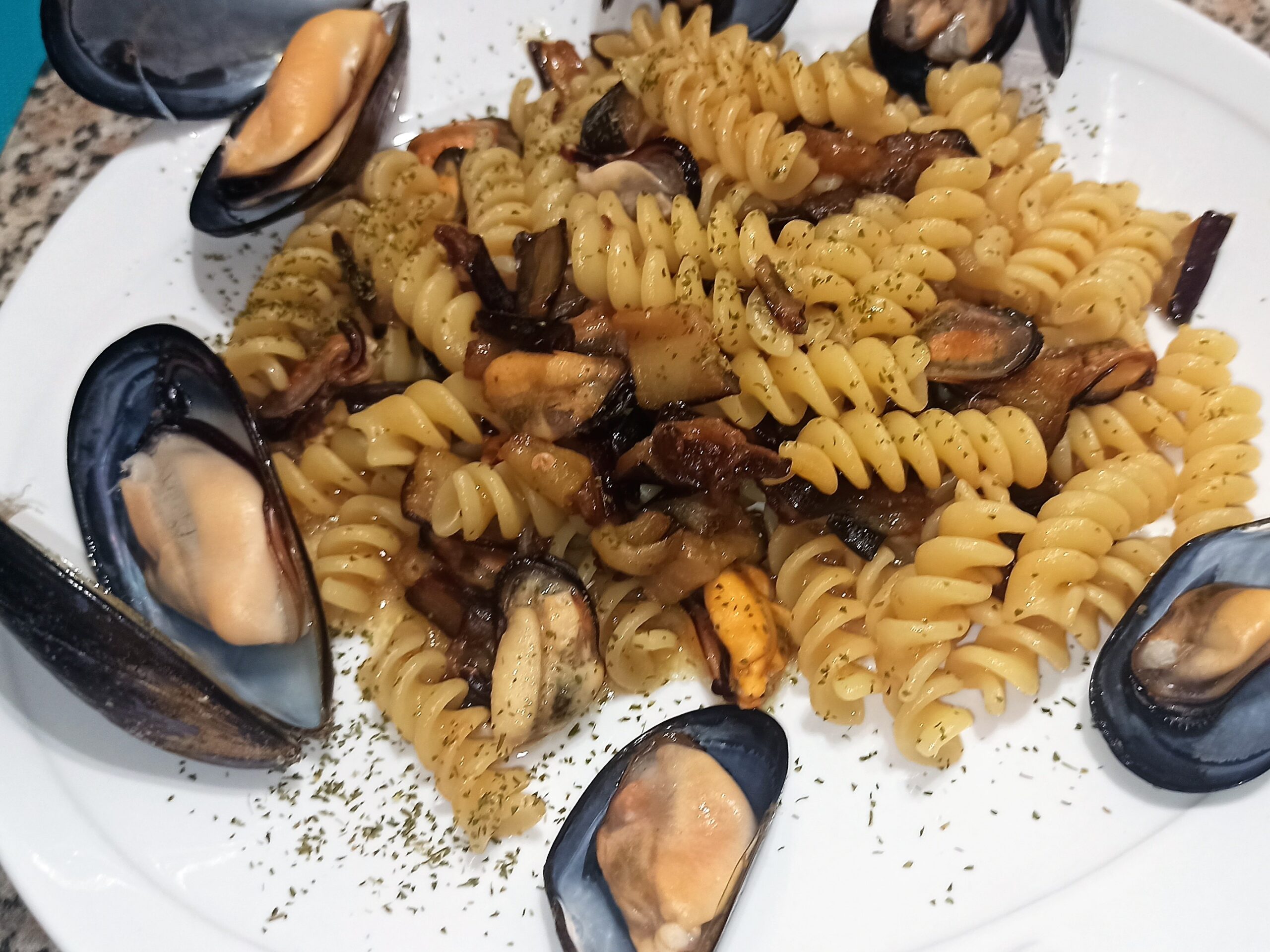 Cuocete al dente la pasta, in abbondante acqua salata, scolatela direttamente nella padella, aggiungete anche le melanzane, amalgamate il tutto. Impiattate completando il piatto con le cozze intere e un trito di prezzemolo.