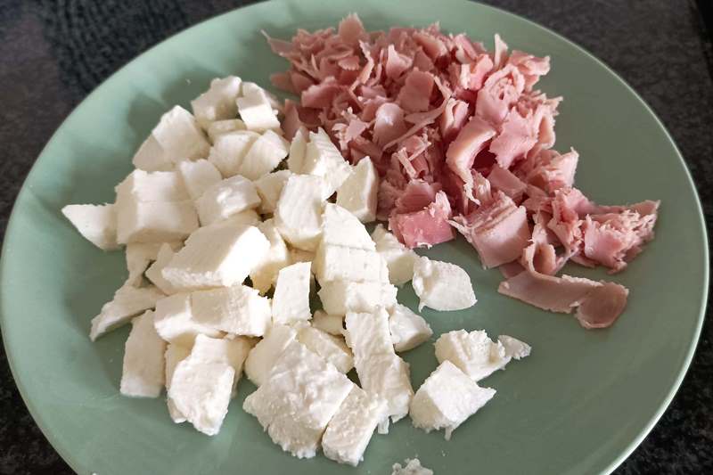 sbriciolate il prosciutto cotto e tagliate a cubetti le mozzarelle.