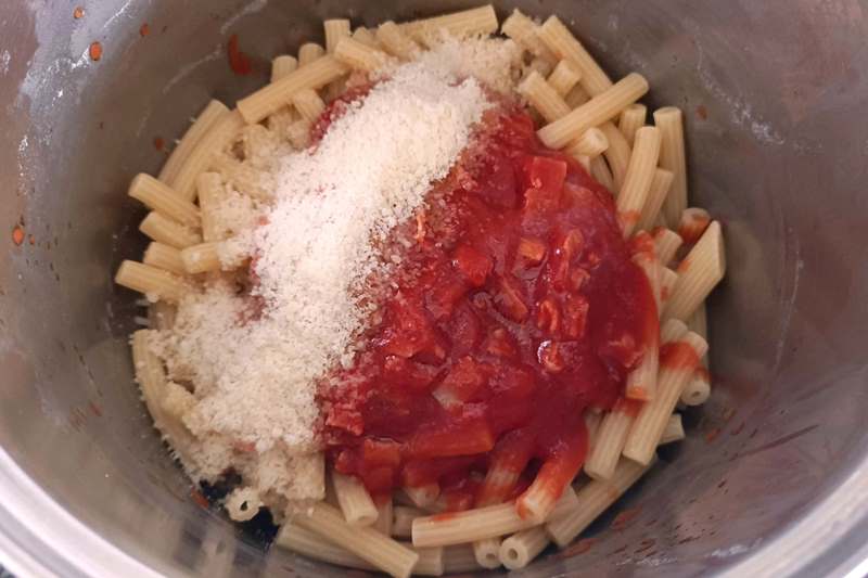 togliete la pentola dal fuoco, mescolate la pasta con il parmigiano, aggiungete anche la mozzarella tenendone qualche cubetto da parte, girando brevemente per evitare che si reimpasti.