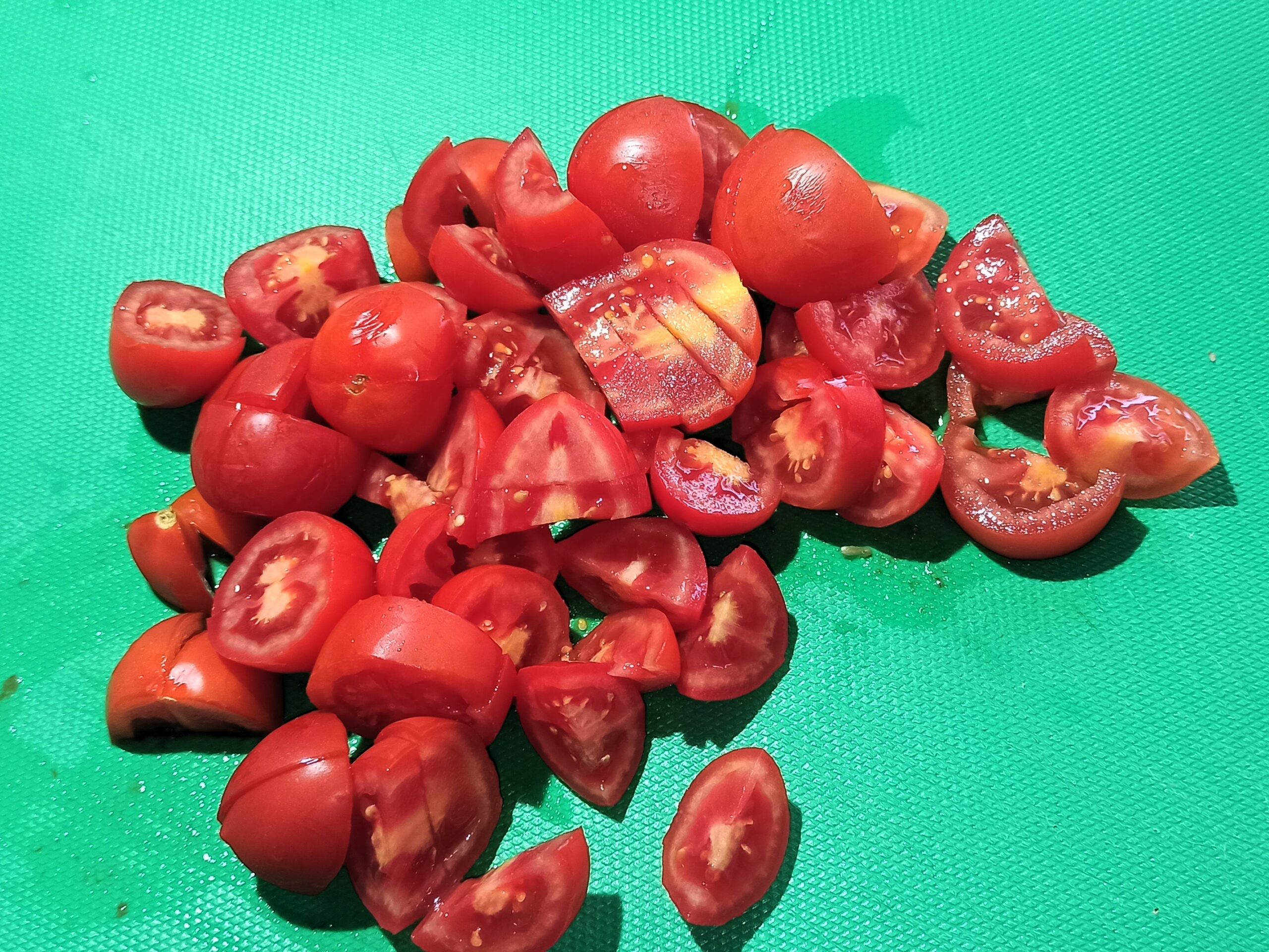 Nella stessa padella, se occorre aggiungete ancora un poco d’olio, fate imbiondire ed eliminate lo spicchio d’aglio. Tagliate a quattro i pomodorini,