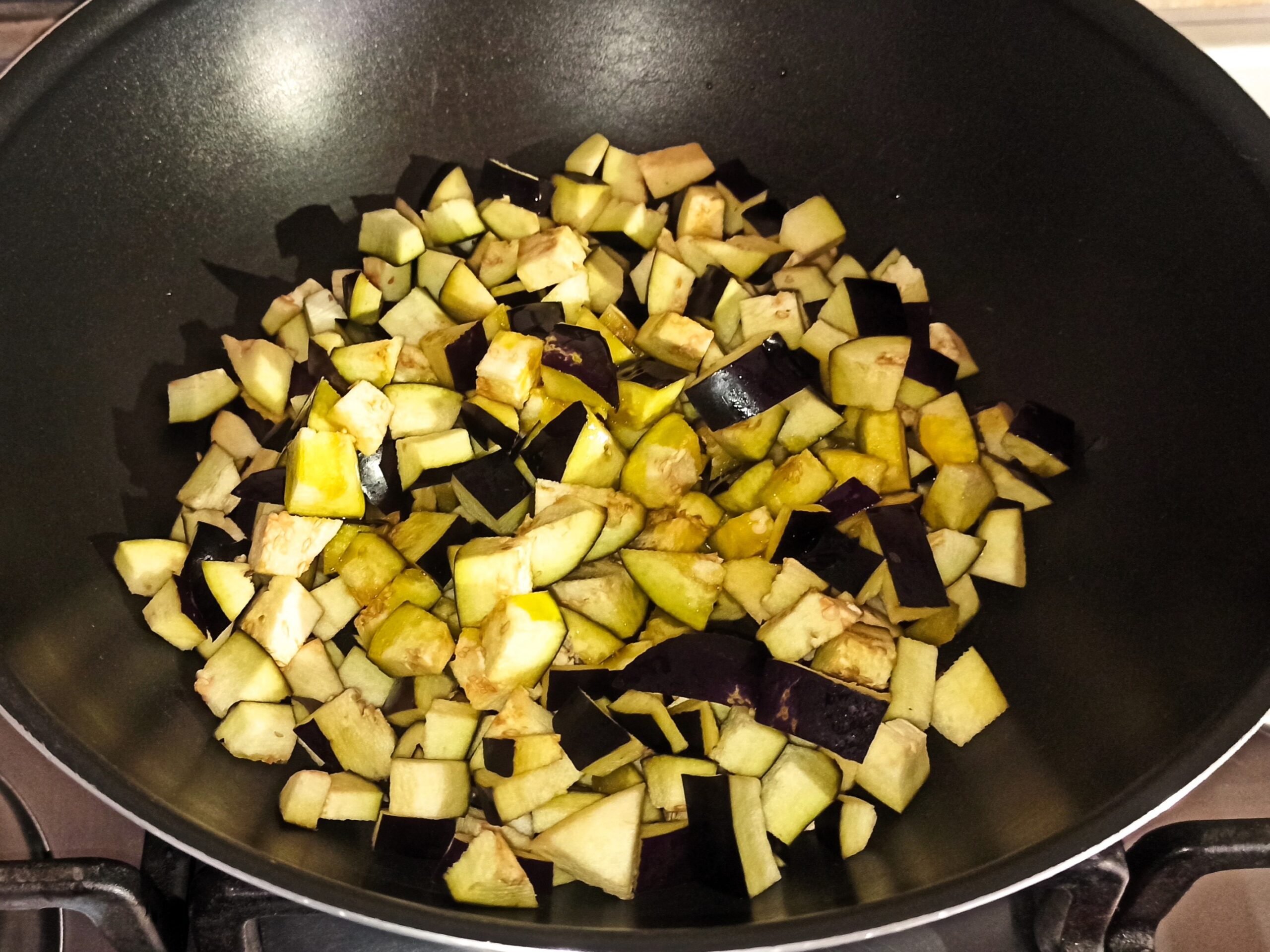 Per preparare la pasta con il sugo alla puttanesca siciliana, iniziate a lavare ed asciugare bene la melanzana. Poi eliminate le due estremità, e tagliatela a dadini. In una capiente padella, mettete un paio di giri di olio evo, aggiungete la melanzana, e fatele cuocere a fiamma viva.