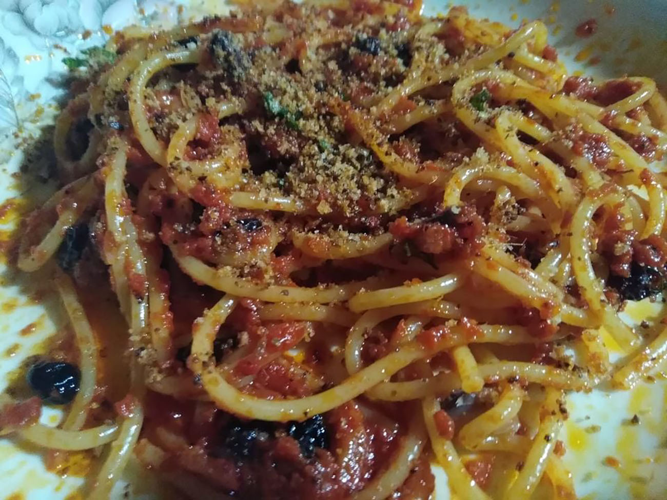 Tritate le mandorle, mettete sul fuoco una padella e versate dentro il pangrattato e le mandorle. Lasciatele abbrustolire. Aggiungete l’olio, un po’ di sale, e lasciate che il tutto si tosti per un massimo di 5 minuti, facendo attenzione a non farlo bruciare. Scolate la pasta al dente e aggiungetela al sugo di pomodoro ultimando la cottura, se serve versando qualche mestolo di acqua di cottura. Terminato ciò spegnete sotto la fiamma e mantecate il tutto con la muddica atturrata e il prezzemolo tritato. Impiattate e servite caldo. La vostra pasta c’anciova è pronta. Buon appetito.