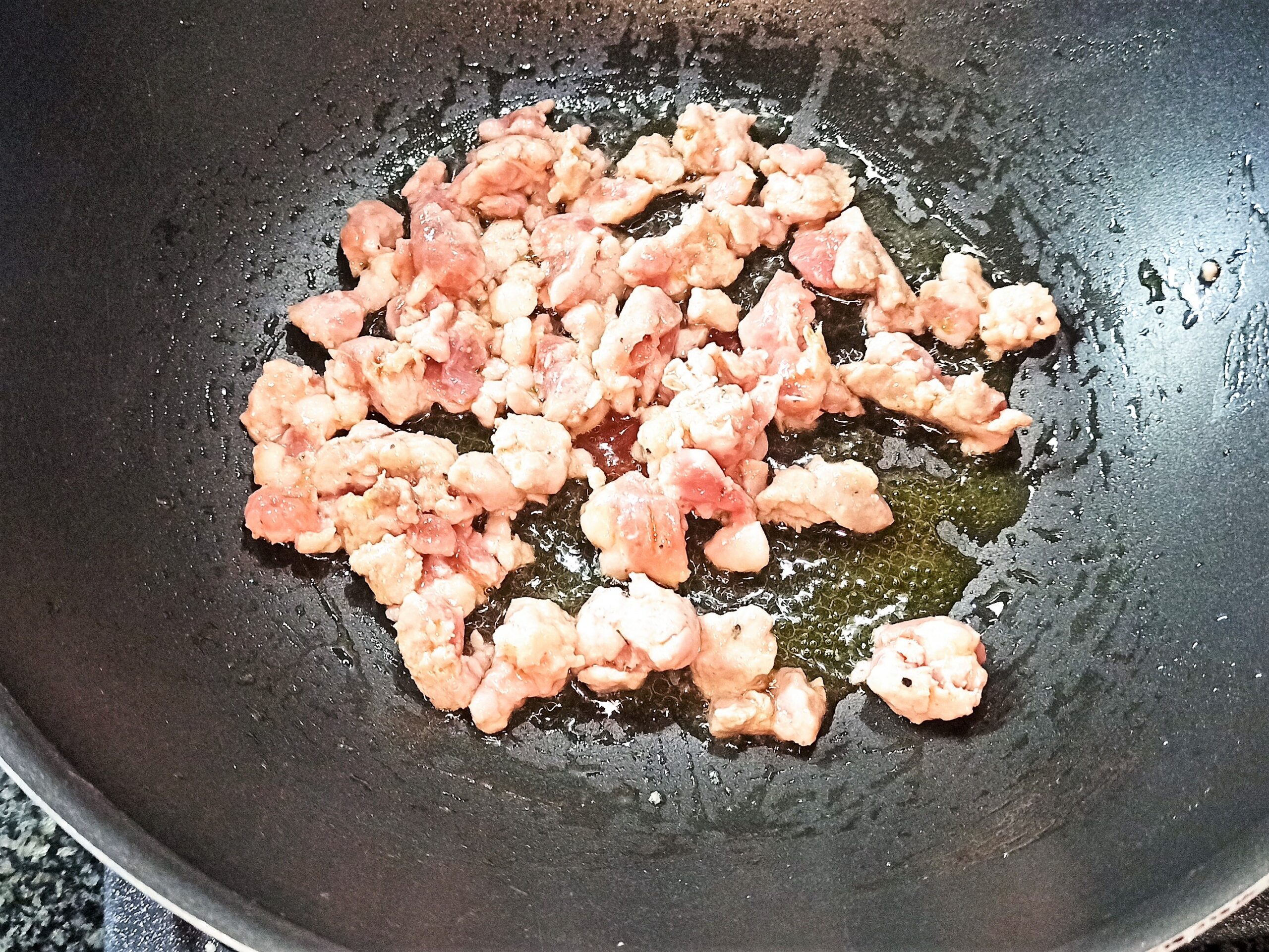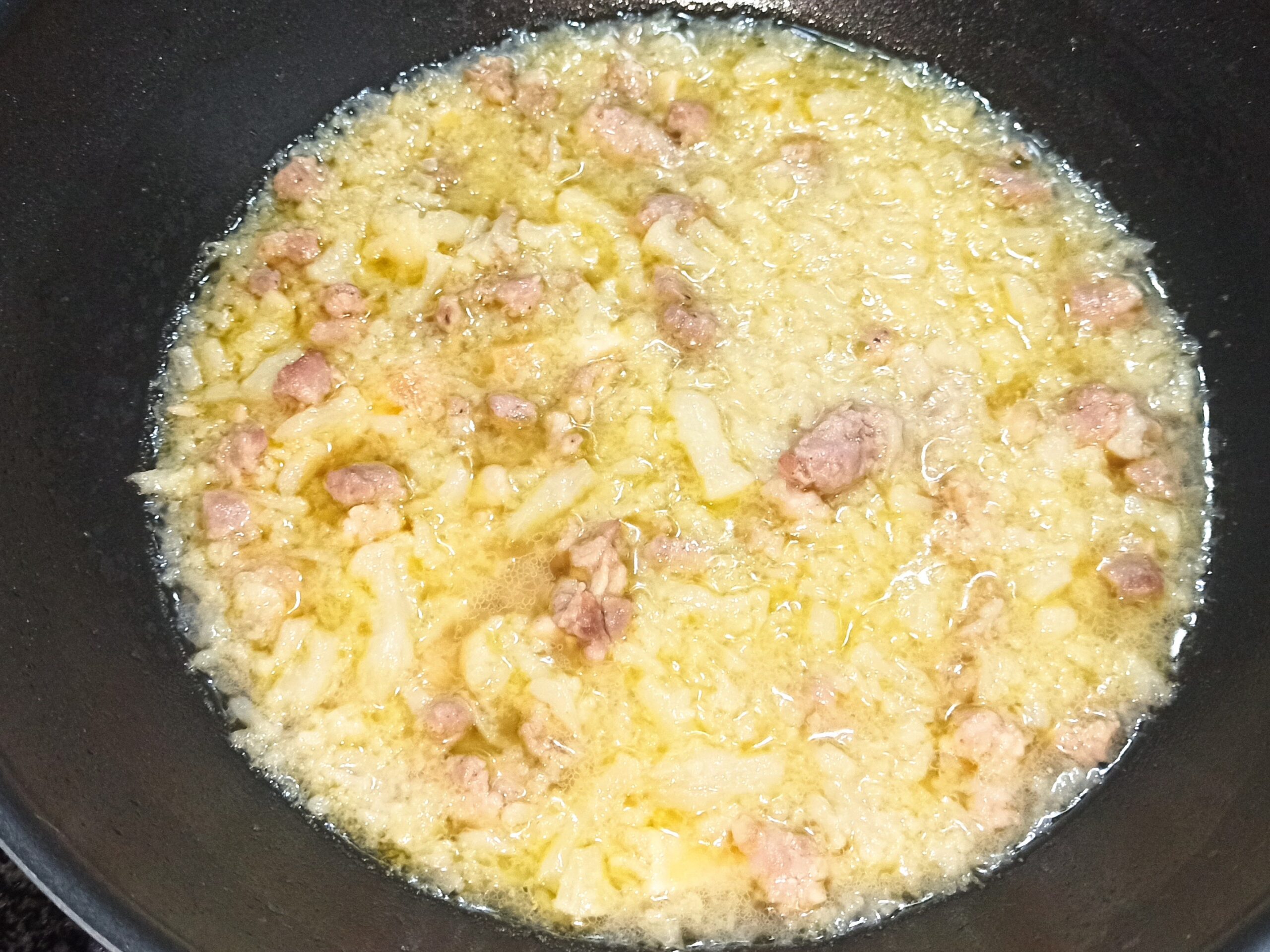 Per preparare la pasta mista con cavolfiore e salsiccia, iniziate a mettere un giro d’olio evo in una capiente padella, unite lo spicchio d’aglio, lasciate imbiondire ed eliminatelo.