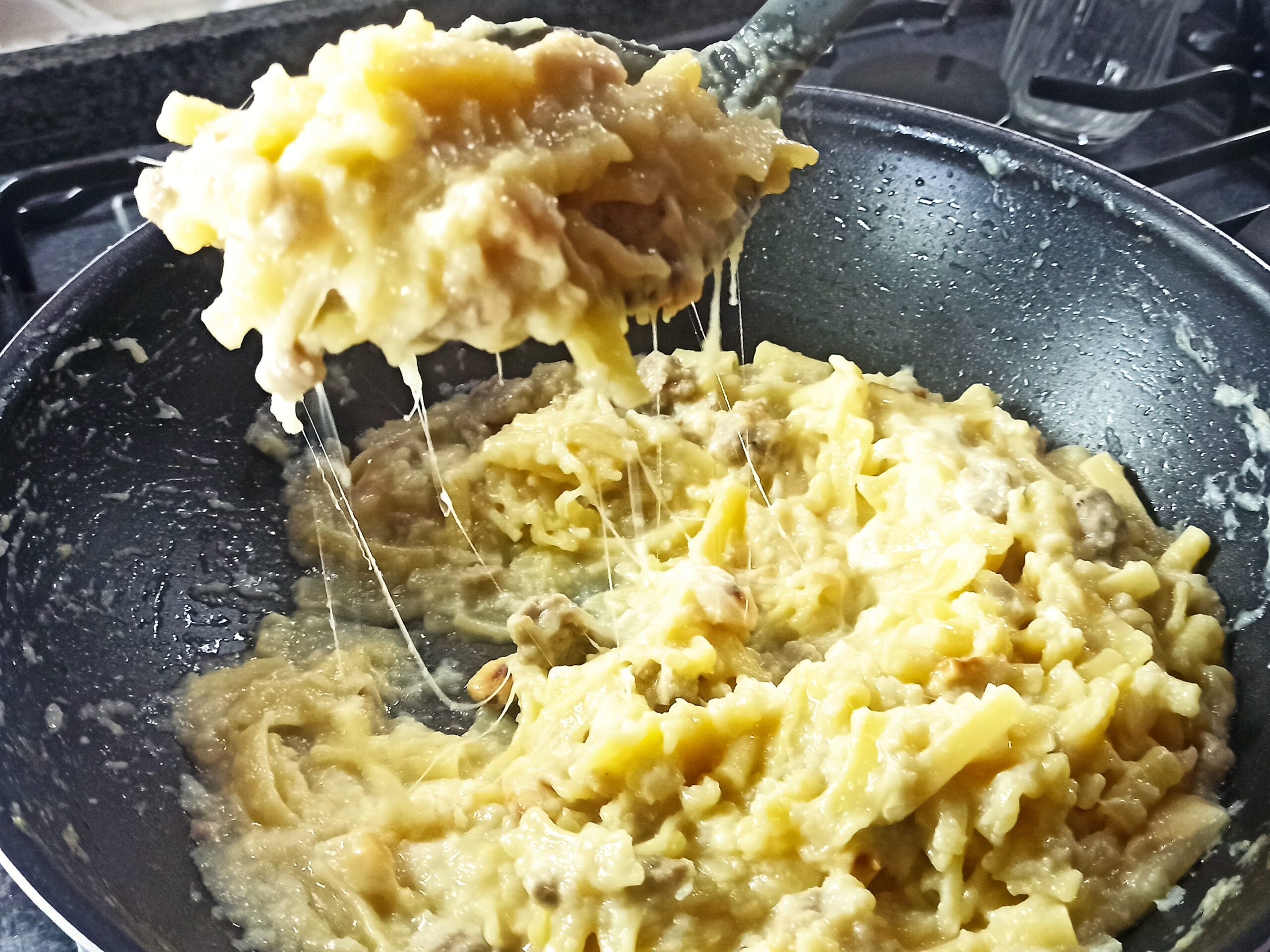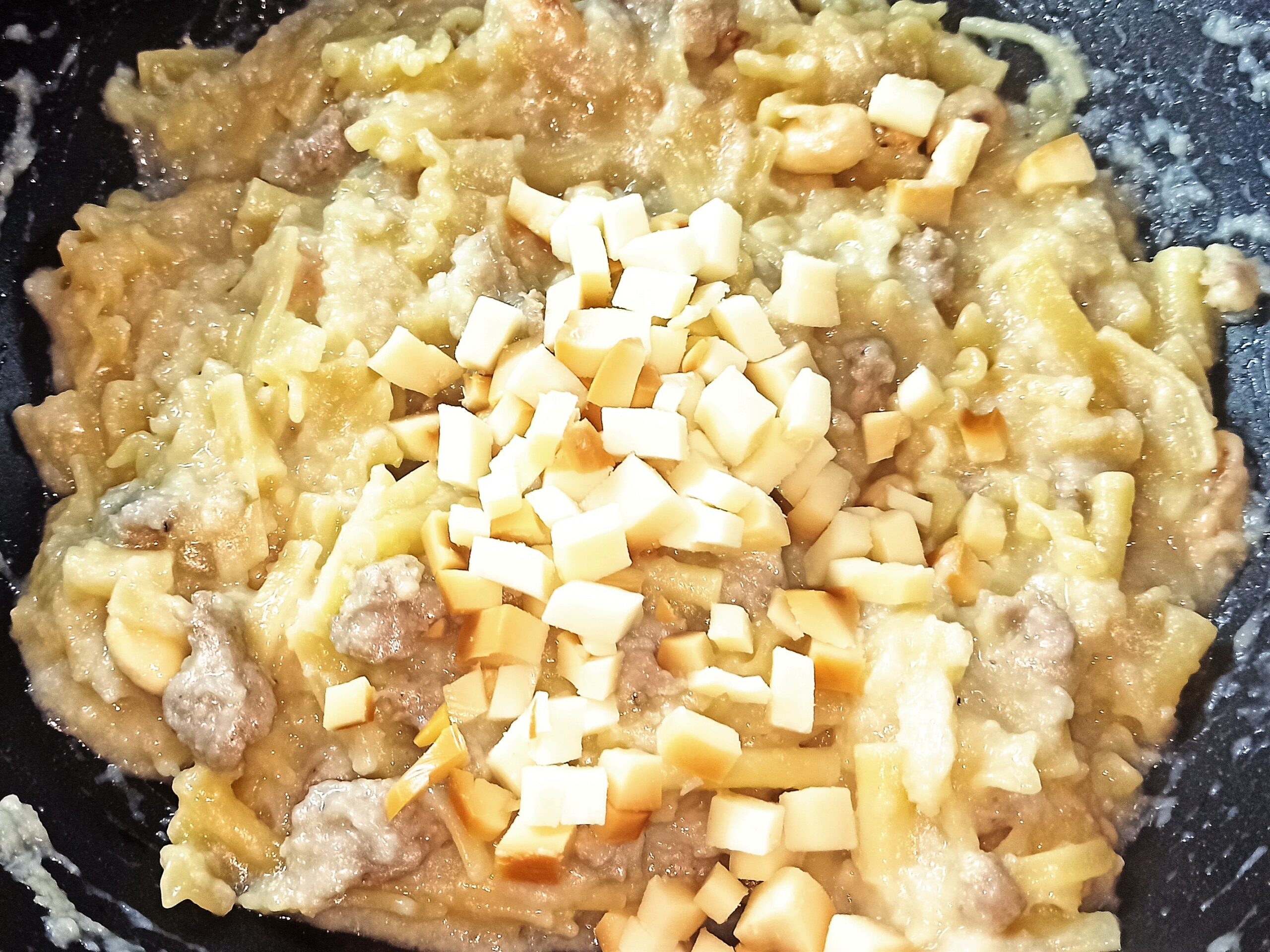 Cinque minuti prima della fine della cottura, unite il parmigiano tagliato a pezzettini, mescolate e terminate la cottura. A cottura ultimata, spegnate la fiamma, unite la scamorza tagliata a cubetti, mescolate bene, impiattate completando il piatto con del pepe macinato al momento.