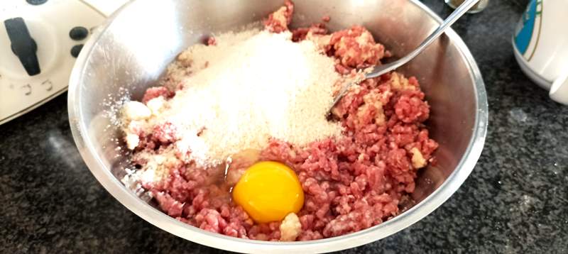 Mettete il pane a bagno in acqua per almeno 15 minuti, fino a quando sarà ben impregnato; strizzatelo bene con le mani e sistematelo in una ciotola e sbriciolatelo a pezzetti; tritate finemente il prezzemolo e l’aglio. Nella ciotola con il pane aggiungete la carne, le uova, i formaggi sale e pepe, ed il trito di aglio e prezzemolo; amalgamate accuratamente e lasciate riposare l’impasto per almeno un ora, in modo che gli ingredienti si insaporiscano.