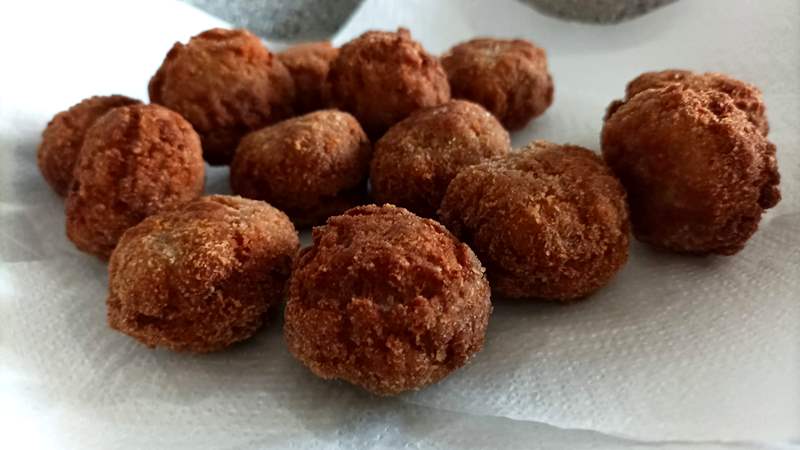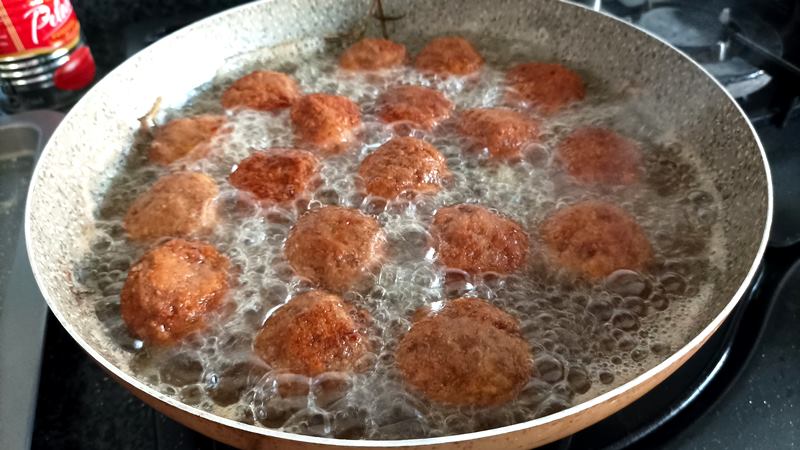 Formate le polpettine prelevando la porzione con un cucchiaio, rigirandole tra le mani l’impasto per dare forma e compattarlo: se le volete ben più croccanti passatele velocemente nel pangrattato. Versate l’olio in una padella a bordi alti e portatelo a temperatura, controllandola con un pezzo di pane, che se sfrigola è pronto per cuocere;