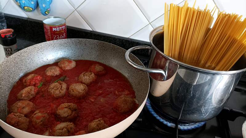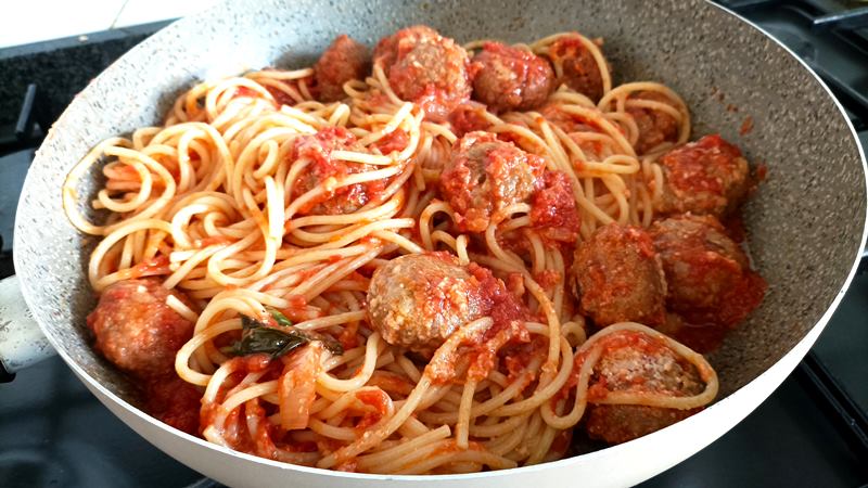 La ricetta originale degli “spaghetti meatballs” importati in America dagli emigrati italiani del Sud: spaghetti al sugo con polpette fritte croccanti, si tratta infatti di una ricetta tradizionale calabrese ed in genere del meridione. Un grande classico dove le polpette vengono prima fritte e poi messe nel sugo di pomodoro, per condire gli spaghetti cotti rigorosamente al dente: una spolverata di pecorino ed il piatto è pronto da servire ben caldo e fumante! Arricchito da altri ingredienti come caciocavallo, salsiccia, uova sode, pecorino e parmigiano, e cotto in forno, crea la famosa Pasta china calabrese una prelibatezza; mentre con gli spaghetti avanzati un goloso riciclo per sontuose frittate di pasta.