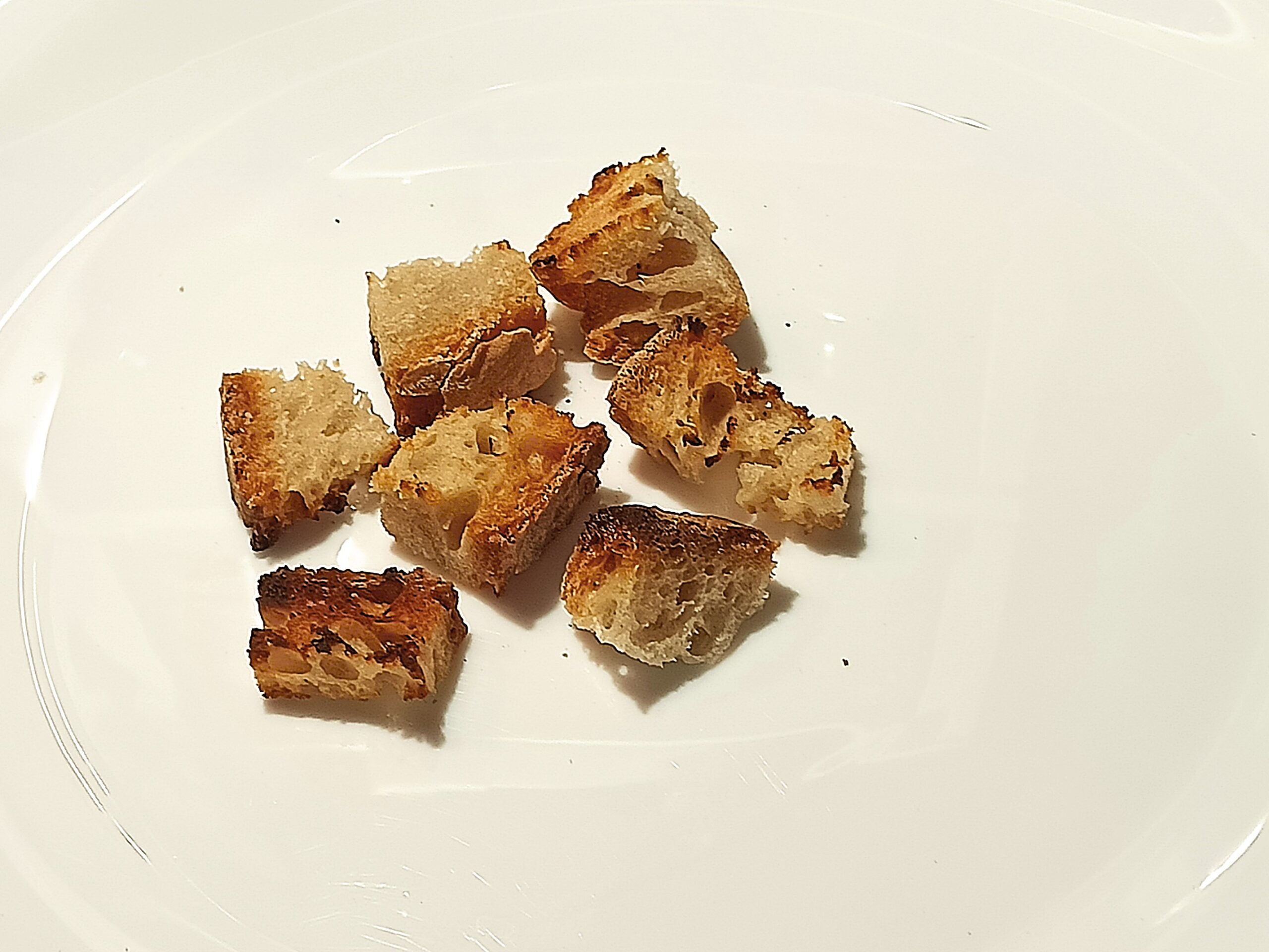 Nel frattempo, tagliate a tocchetti le fette di pane, fatele tostare in una padella antiaderente, aggiungendo pochissimo olio, e un rametto di rosmarino. Dividete i crostini sul fondo del piatto da portata, conservatene un paio per guarnire il piatto finale,
