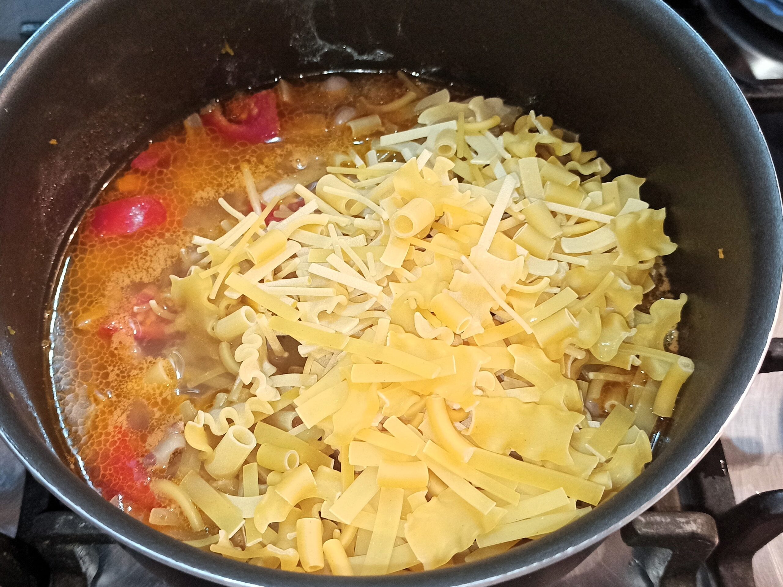 Trascorso questo tempo, aggiungete la pasta, iniziate la cottura, aggiungendo, a bisogno, altro liquido di cottura dei borlotti. Se occorre regolate di sale.