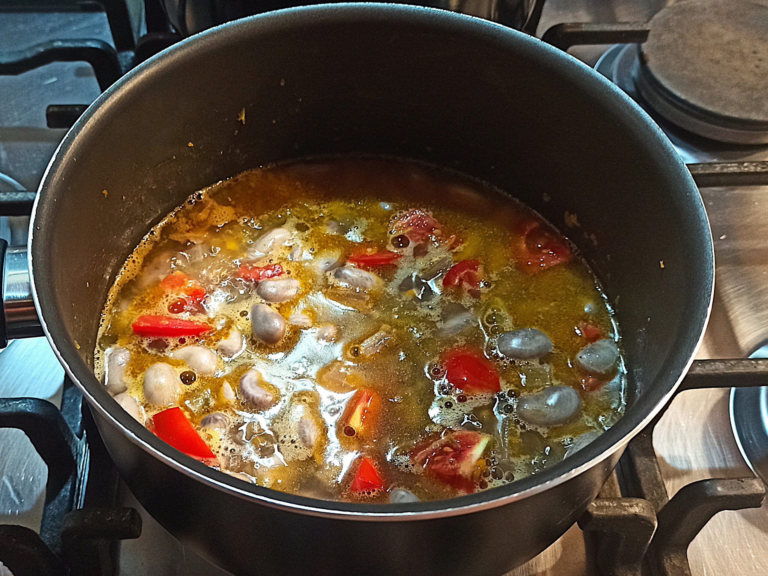 Lasciate rosolare per un minuto, poi aggiungete i borlotti, aumentate la fiamma e sfumate con il vino bianco. Fate evaporare l’alcol, aggiungete i pomodorini tagliati a pezzetti, un poco di liquido di cottura dei borlotti, e lasciate cuocere a fiamma bassa per dieci minuti.