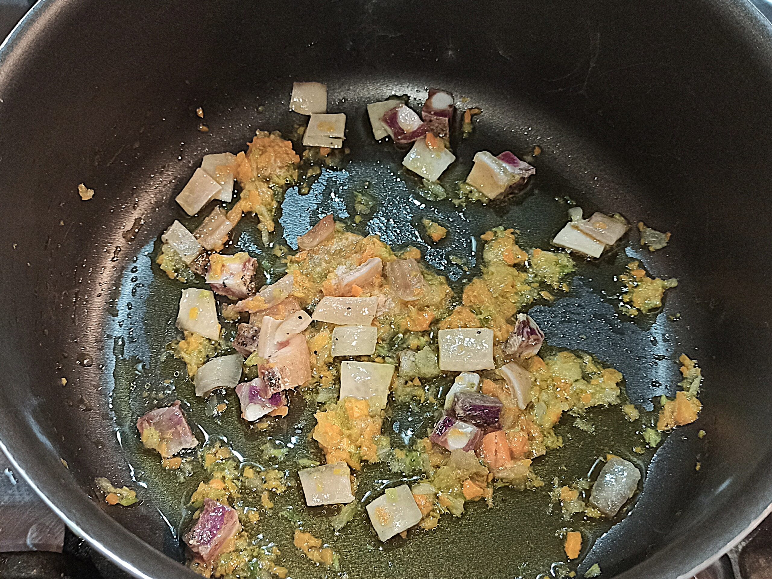 Colateli, e conservate l’acqua di cottura. Mettete un giro abbondante di olio evo in un pentolino, aggiungete le verdure tritate, lasciate sfrigolare qualche secondo, ed aggiungete la pancetta e la cotica, tagliata a tocchetti.