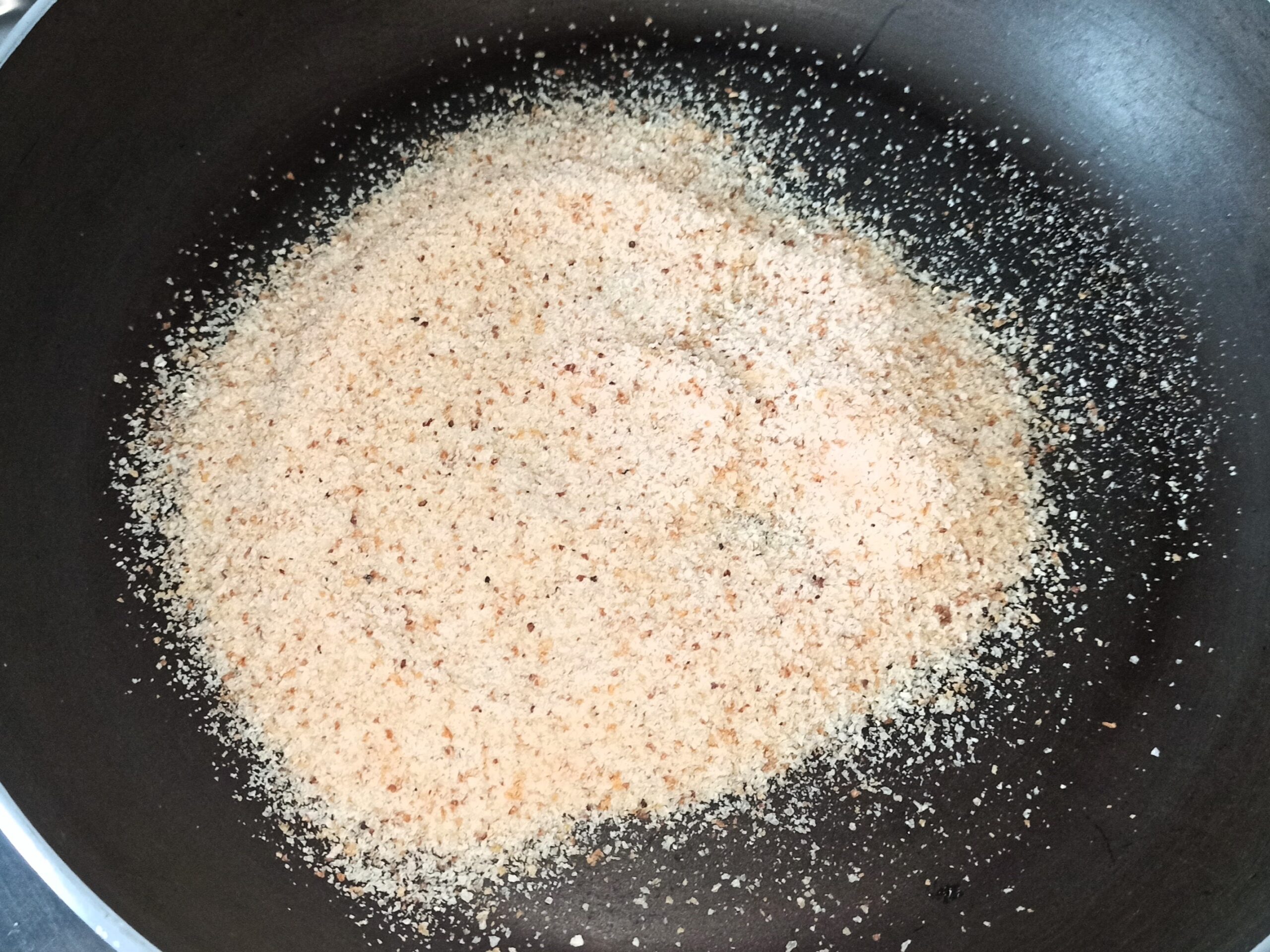 Nel frattempo che la pasta cuoce, riscaldate una padella, versate il pane grattugiato, tostatelo facendo attenzione che non bruci.