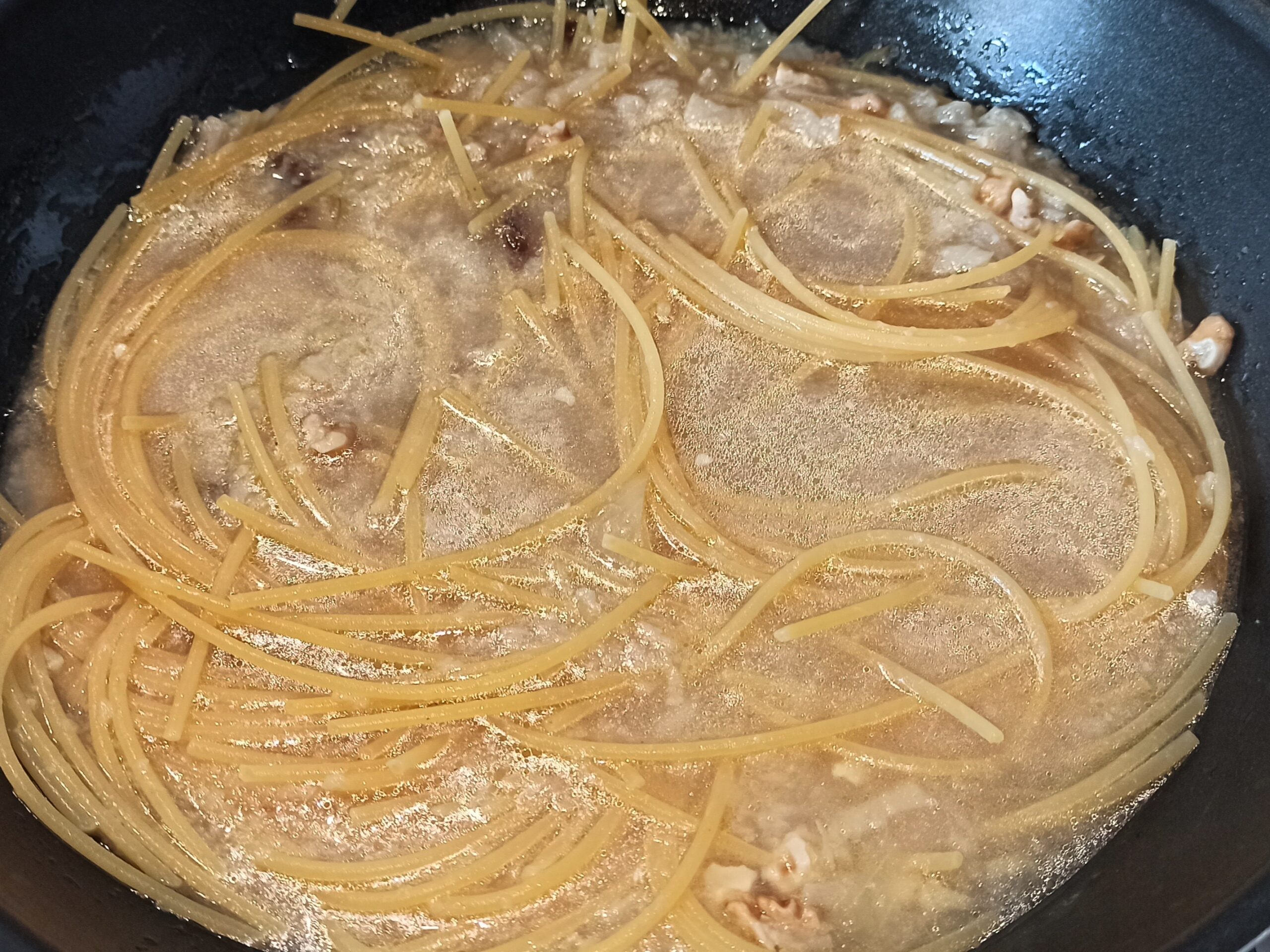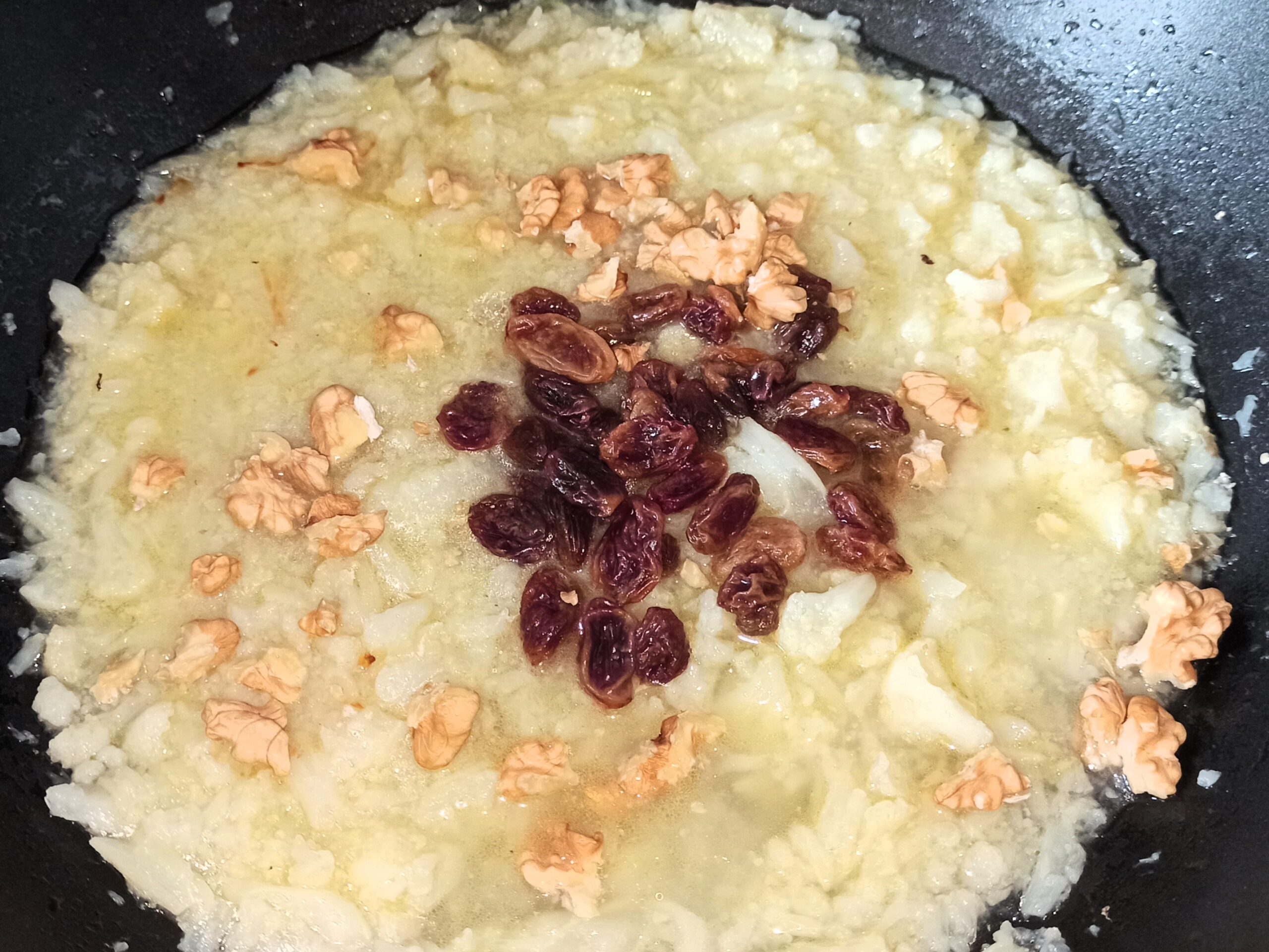 Trascorso questo tempo, sgusciate e spezzettate le noci, unitele nella padella insieme all’uvetta.