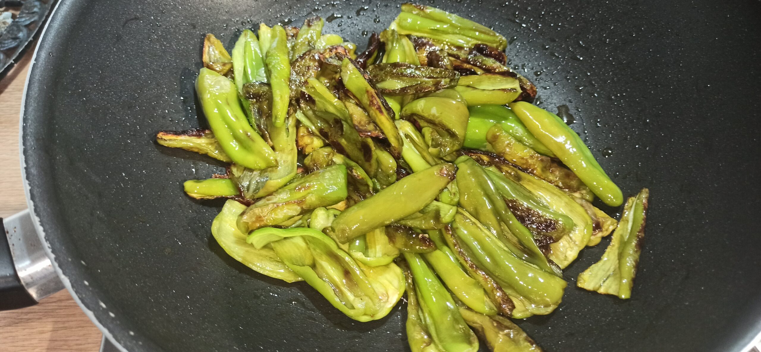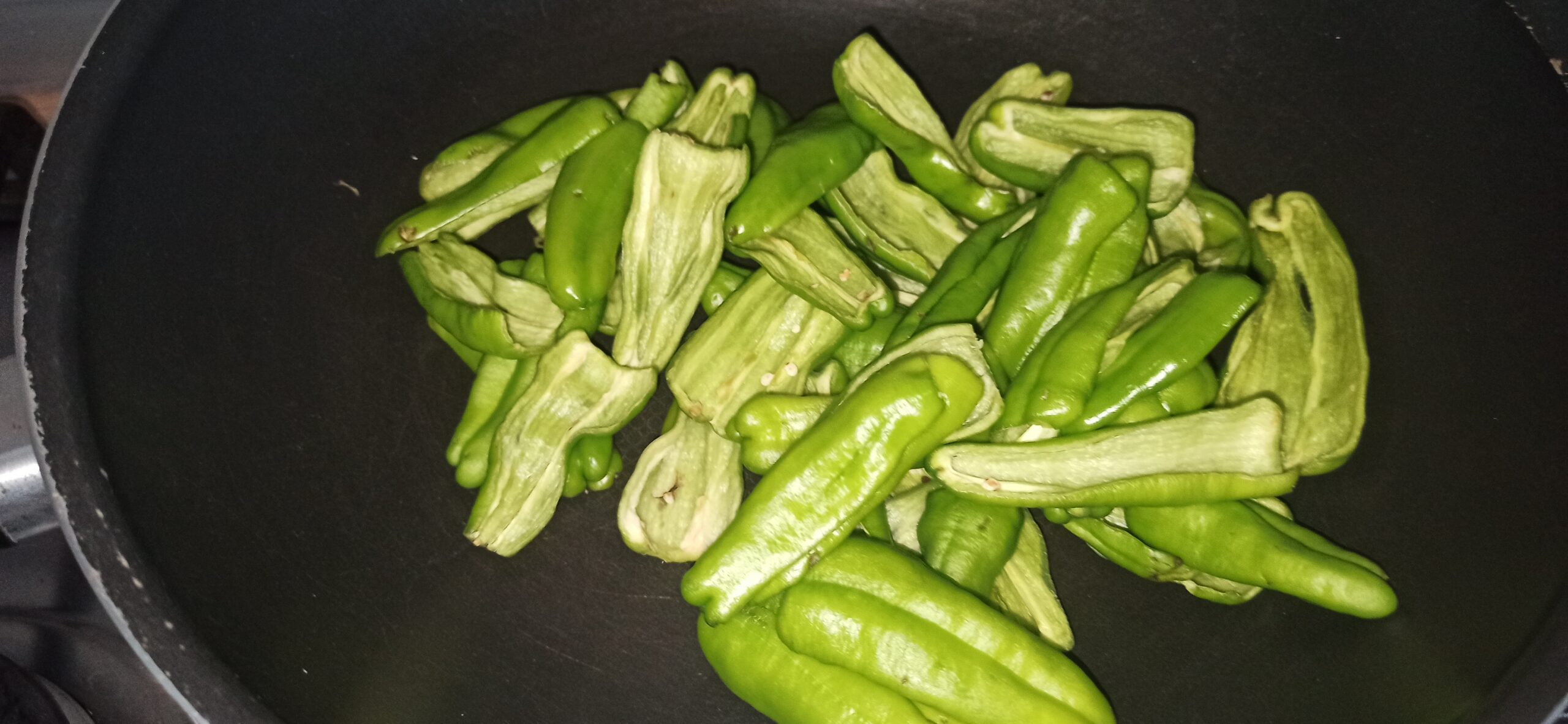 Poi, tagliateli a metà, ed eliminate il picciolo ed i semi. In una capiente padella, mettete un paio di giri abbondanti di olio evo, lasciate imbiondire lo spicchio d’aglio, ed eliminatelo, aggiungete i friggitelli.