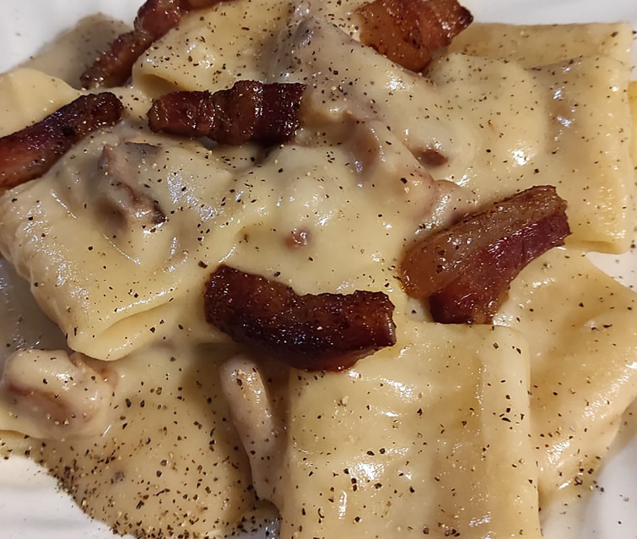 Fate cuocere gli gnocchetti sardi in abbondante acqua bollente e salata. Scolateli al dente e trasferiteli subito nella padella con il grasso, quindi saltateli per insaporirli. Unite la crema di patate e amalgamatela bene, se c’è bisogno potete aggiungere un po’ di acqua di cottura degli gnocchetti. Completate unendo la pancetta. Impiattate e date un’altra spolverata di pepe nero. La vostra pasta con crema di patate e pancetta è pronta. Buon appetito.